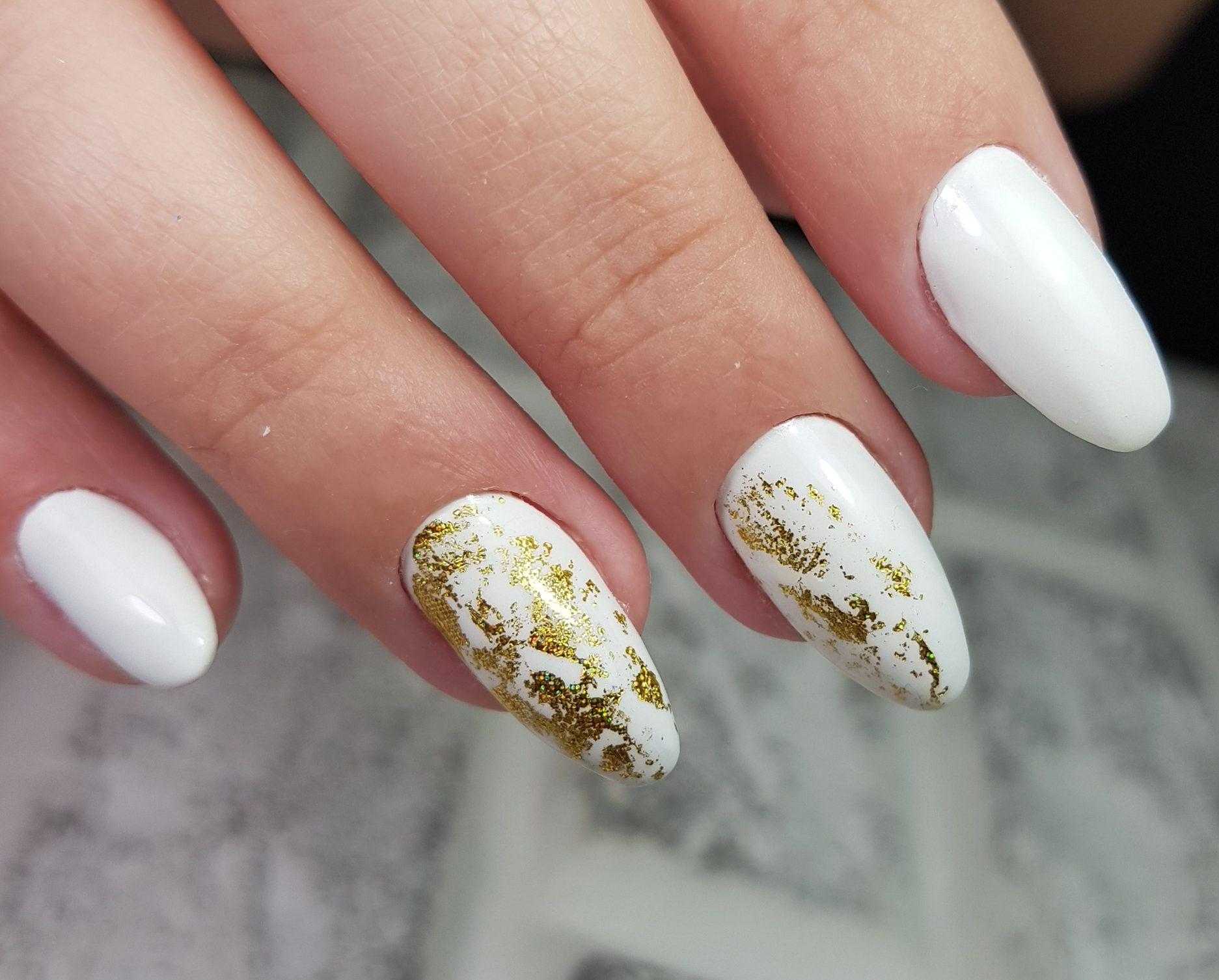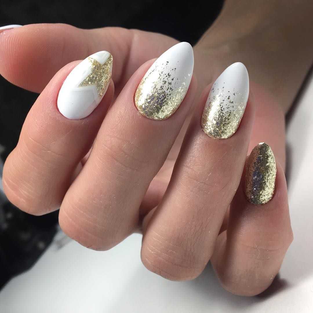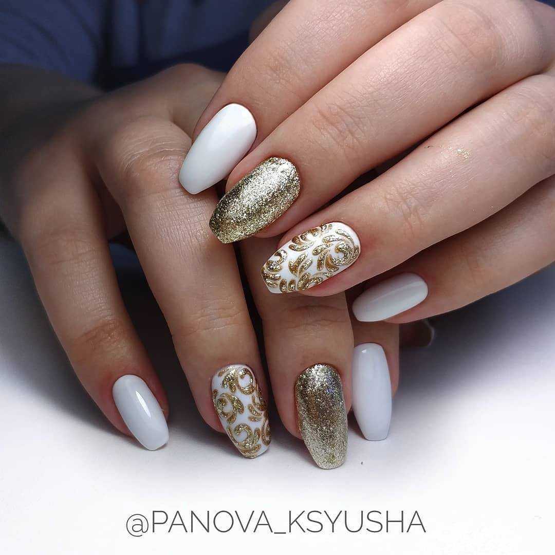 - дизайн с золотым глиттером – белый и золотой – сочетание, которое всегда смотрится шикарно и благородно. Такой нейл-арт отлично впишется в ваш повседневный образ, даже несмотря на неординарность оттенков.