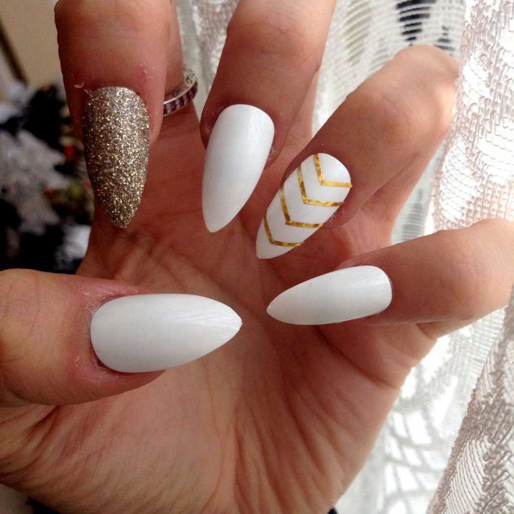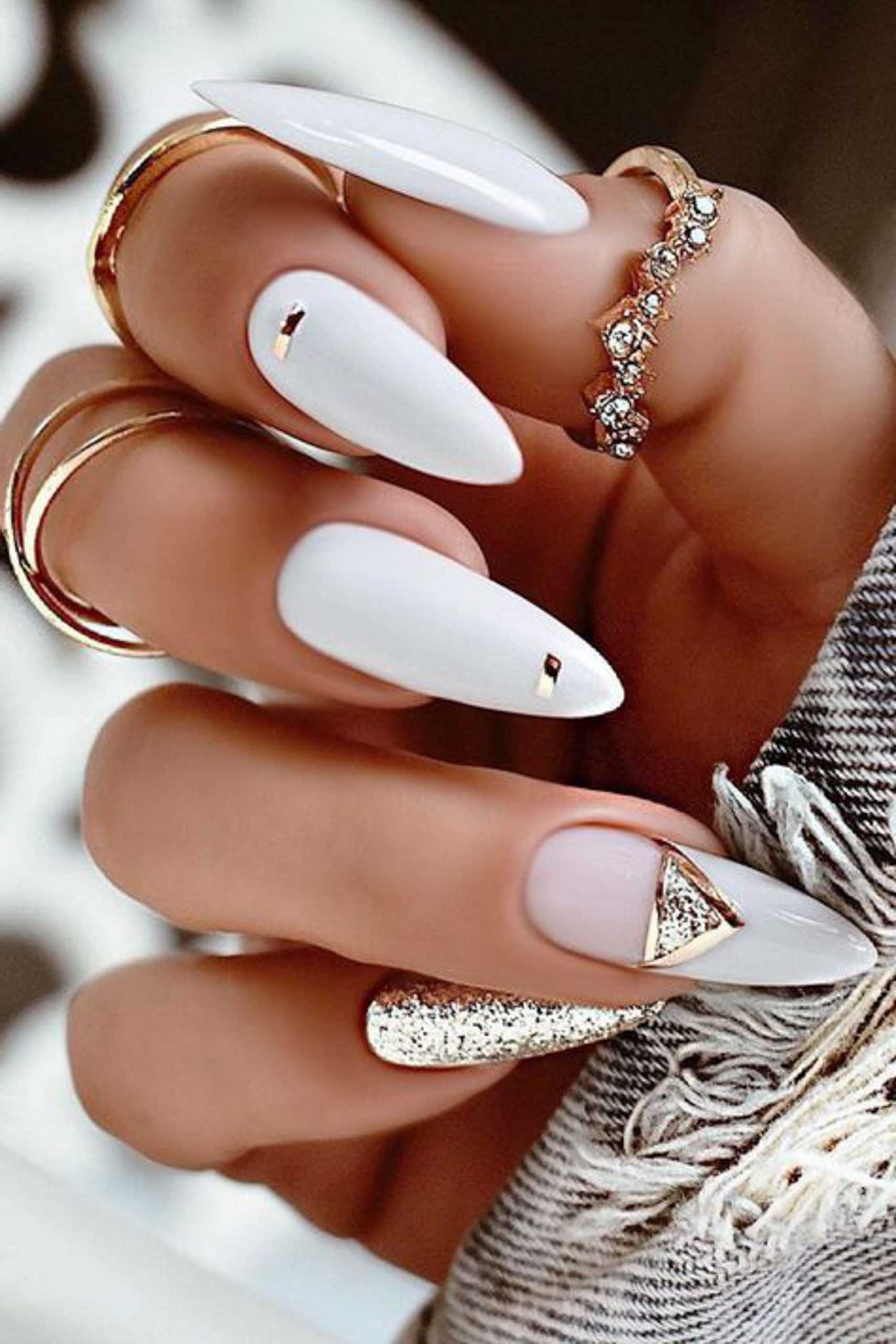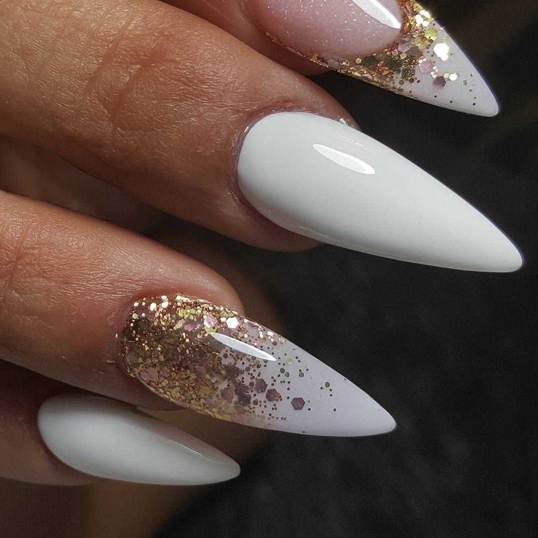 - дизайн с золотым глиттером – белый и золотой – сочетание, которое всегда смотрится шикарно и благородно. Такой нейл-арт отлично впишется в ваш повседневный образ, даже несмотря на неординарность оттенков.