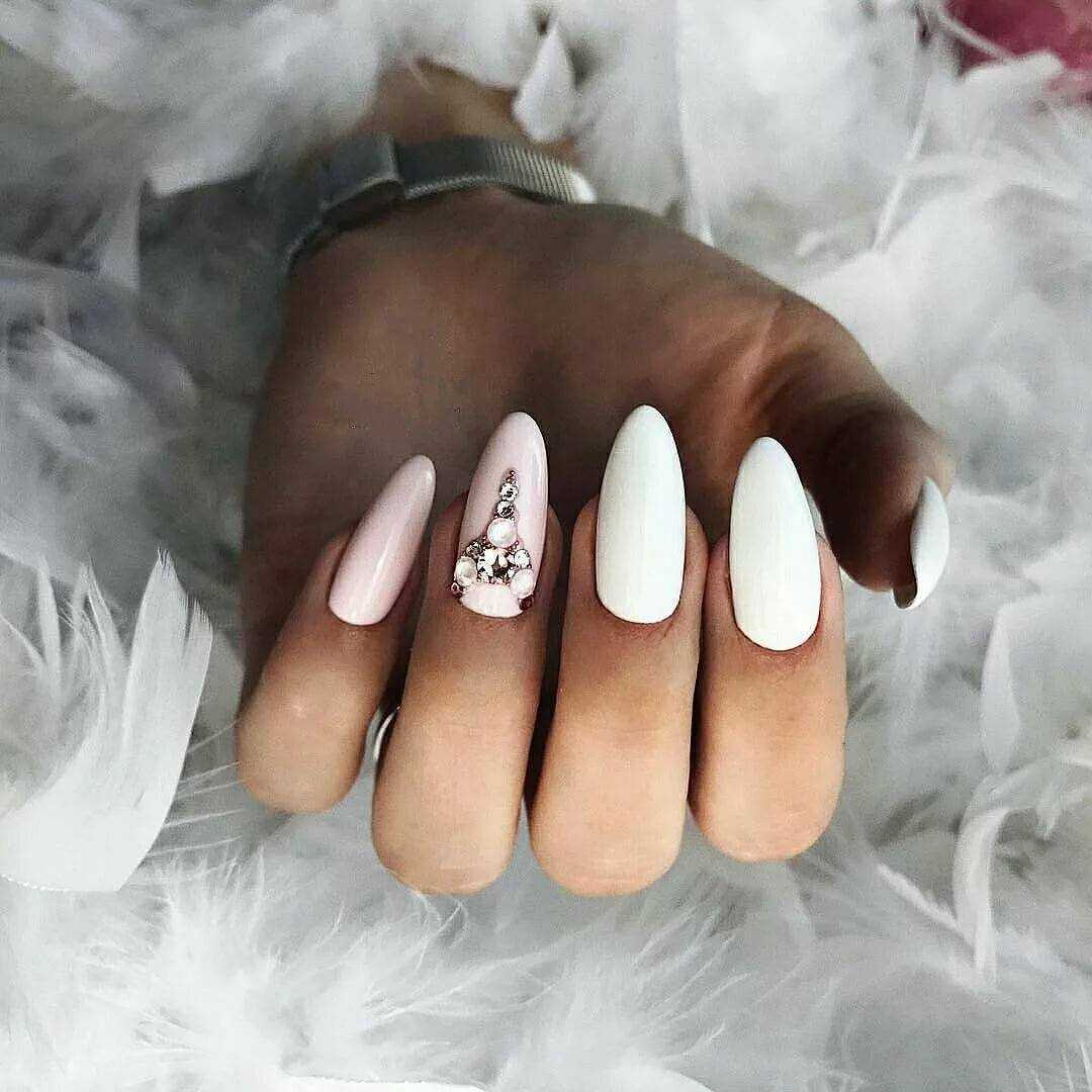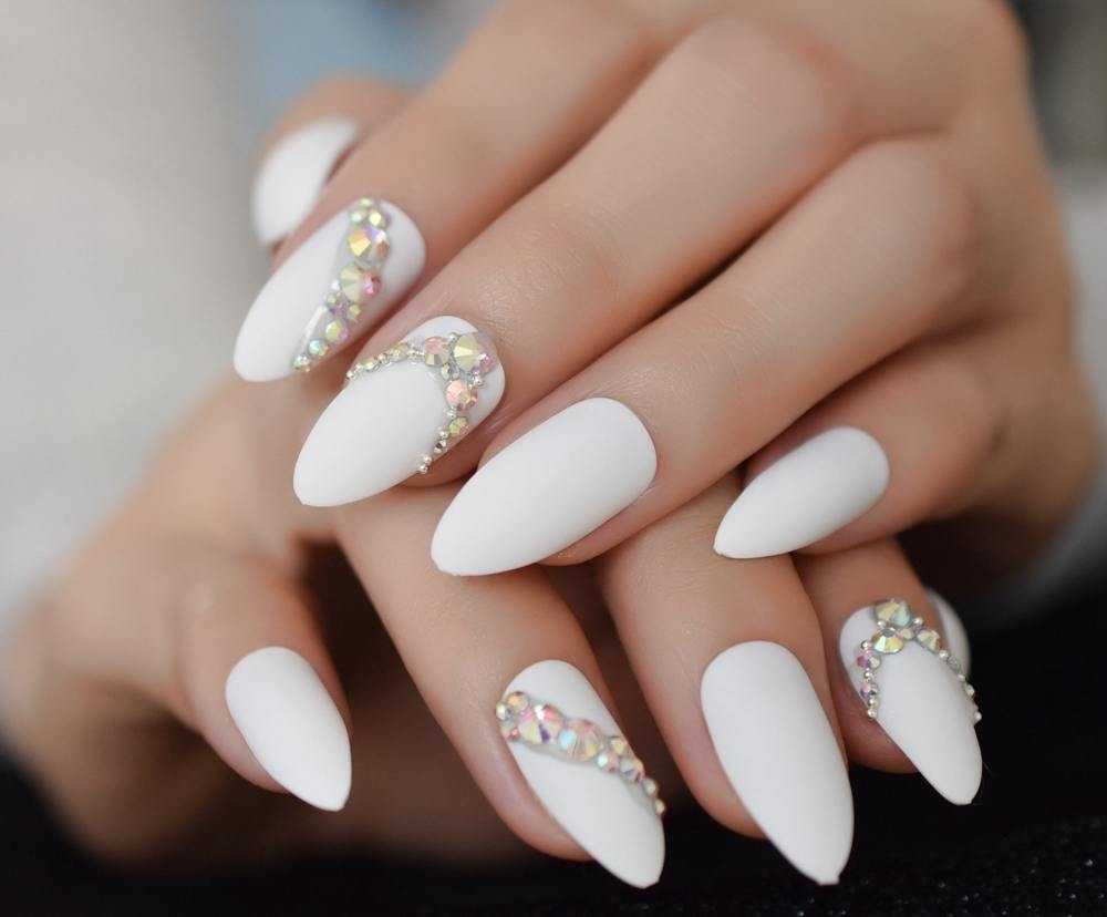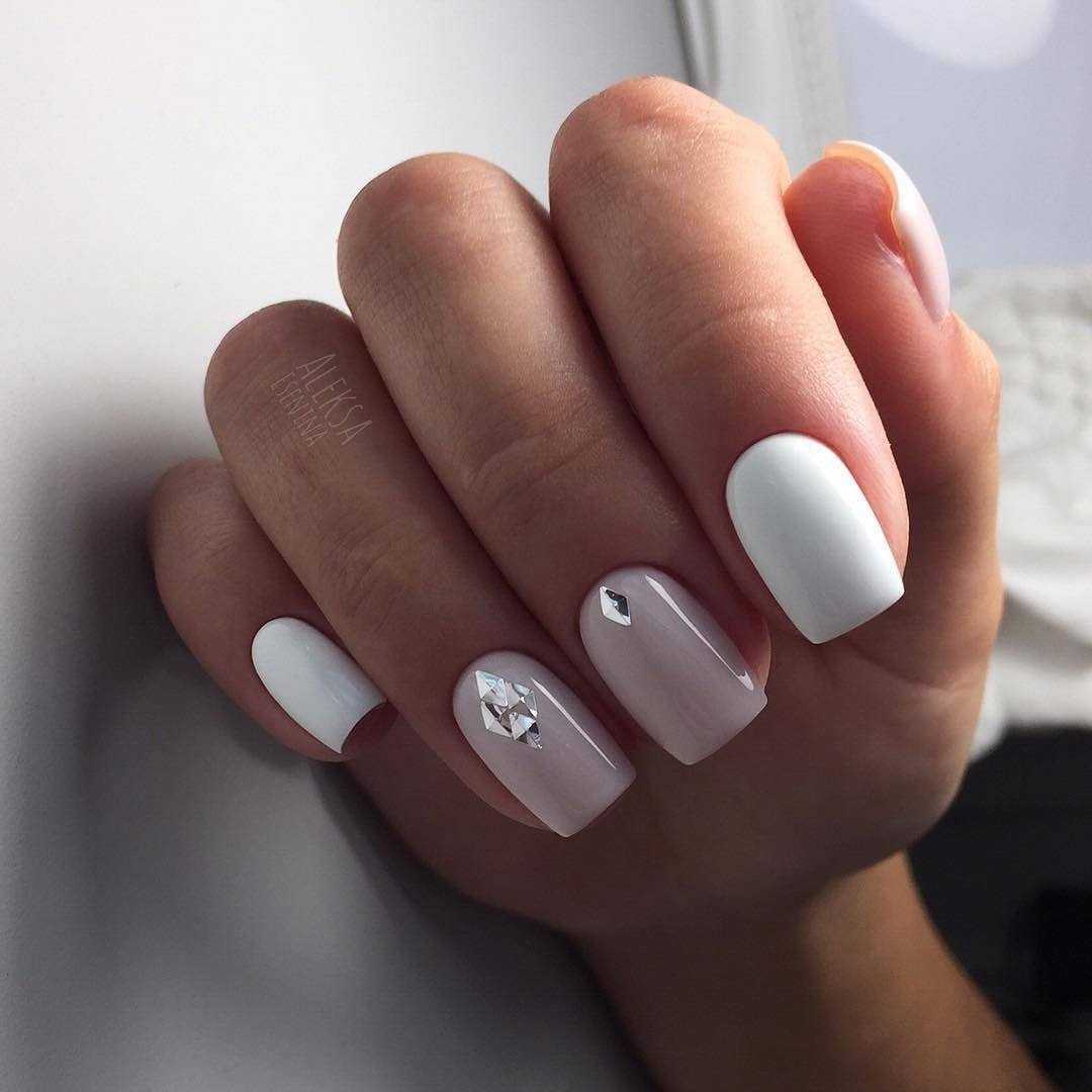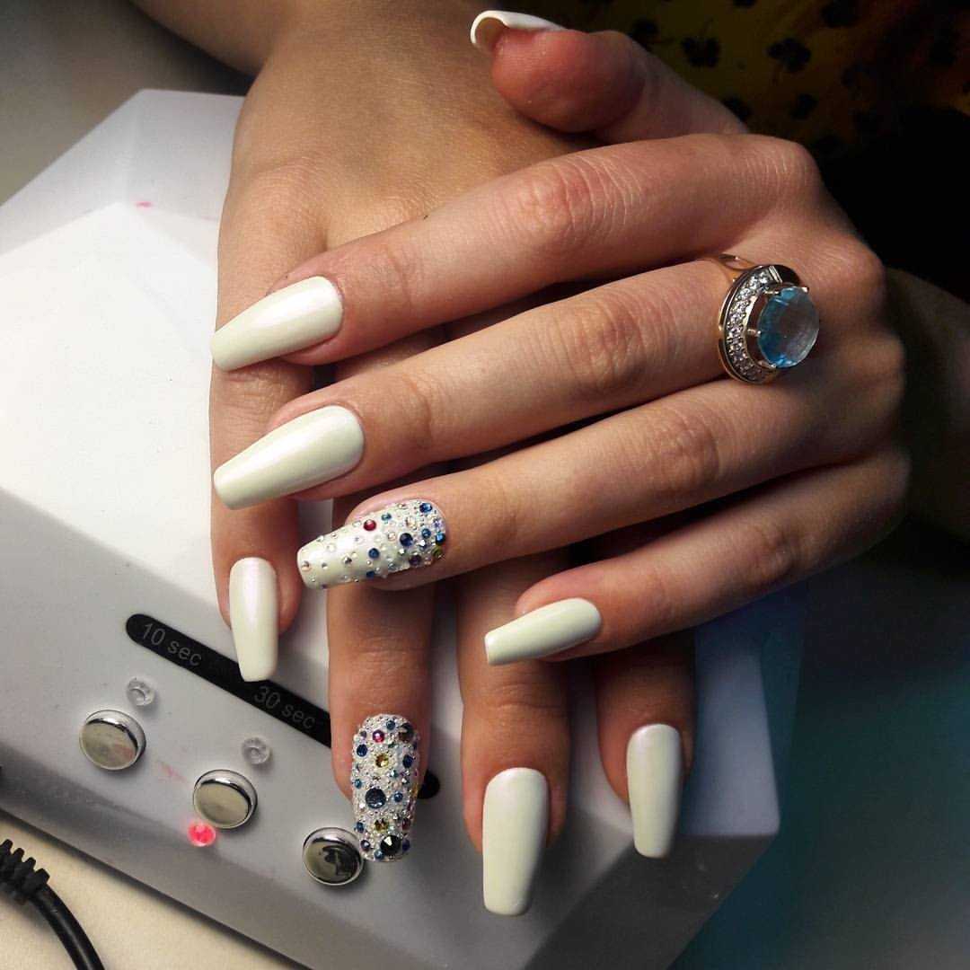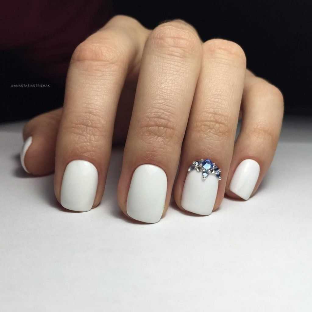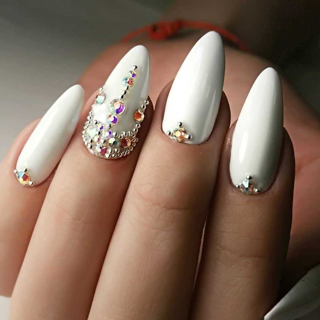 - белый маникюр со стразами – лучшее, что можно придумать для декора белых ногтей. Используйте помимо серебряных и золотых стразов, камни красного, синего цвета.