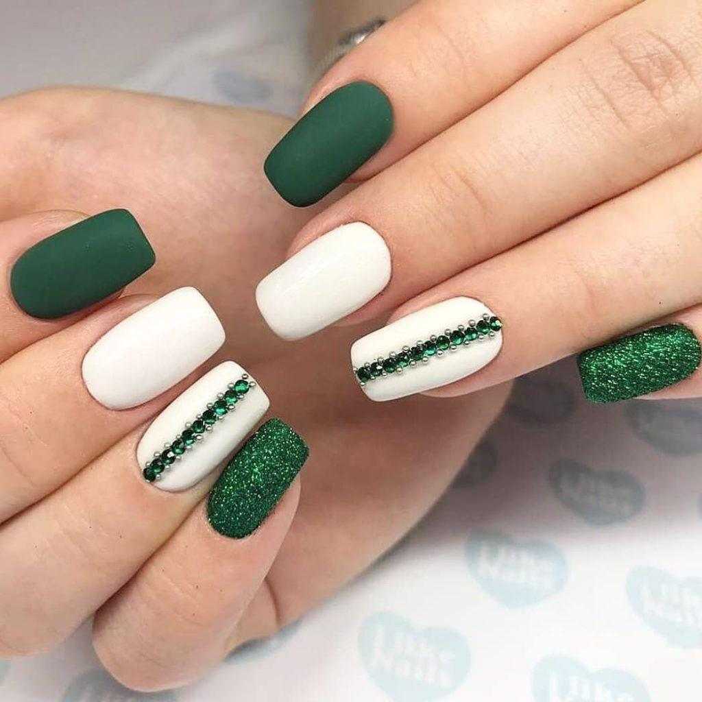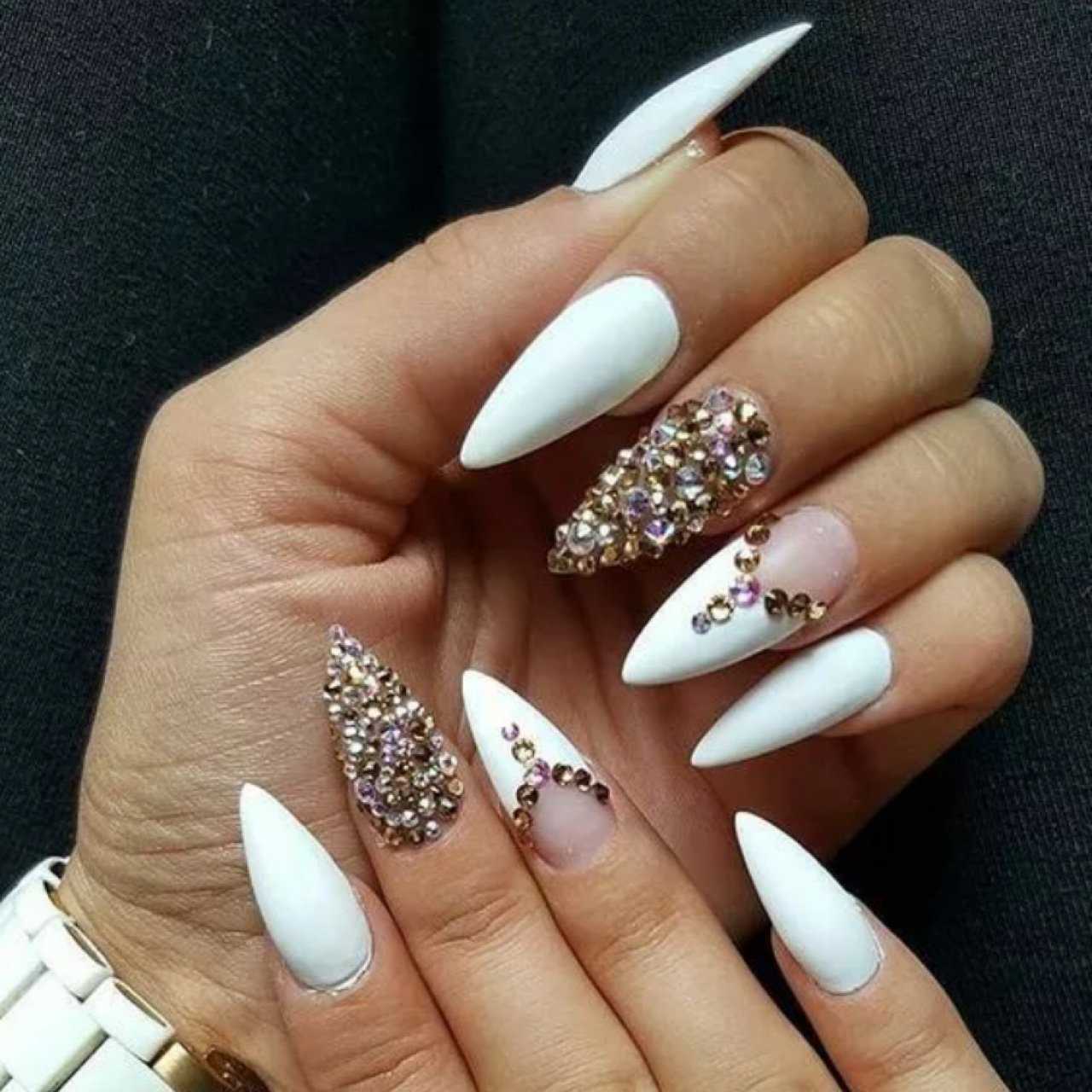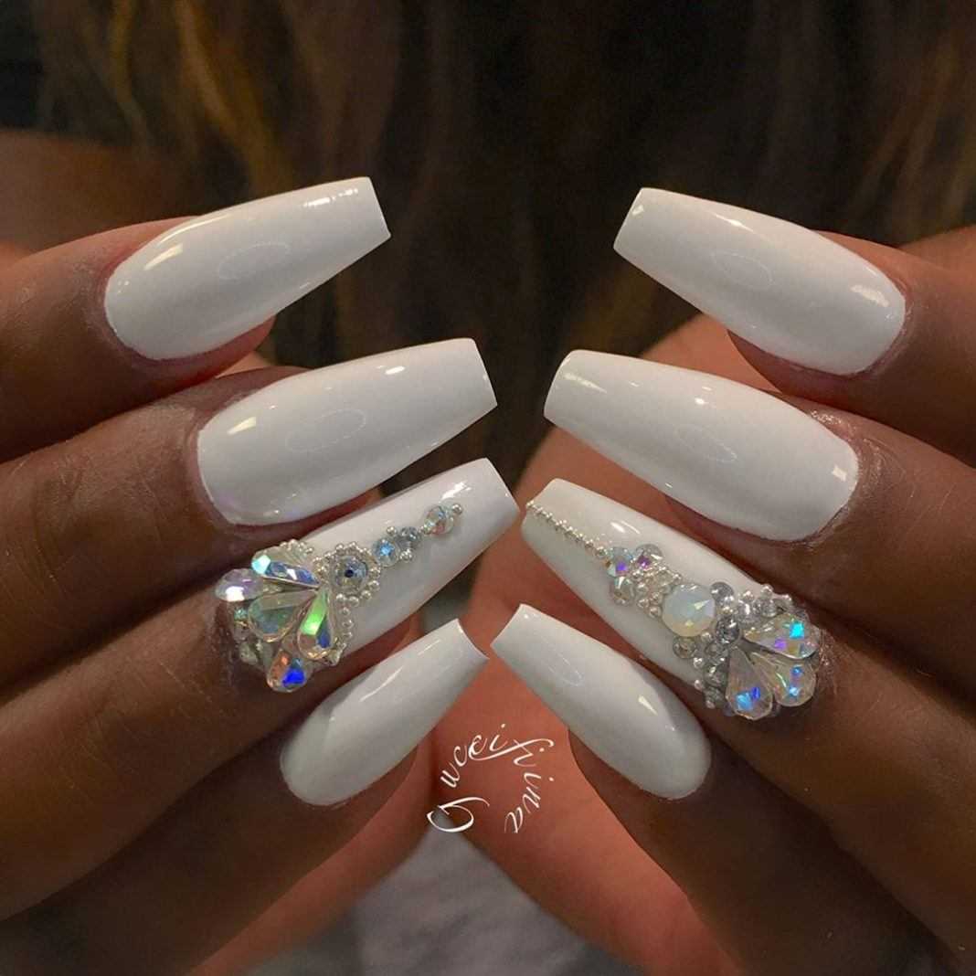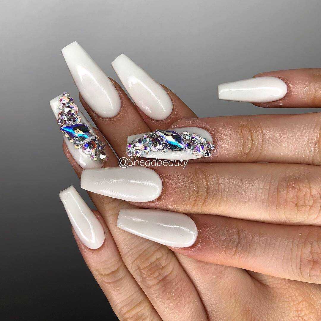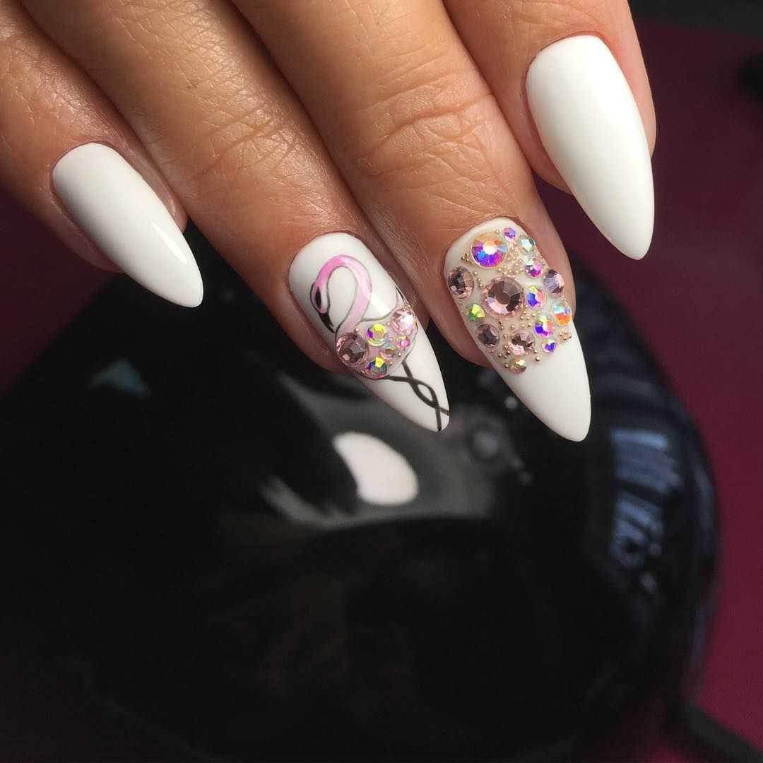 - белый маникюр со стразами – лучшее, что можно придумать для декора белых ногтей. Используйте помимо серебряных и золотых стразов, камни красного, синего цвета.
