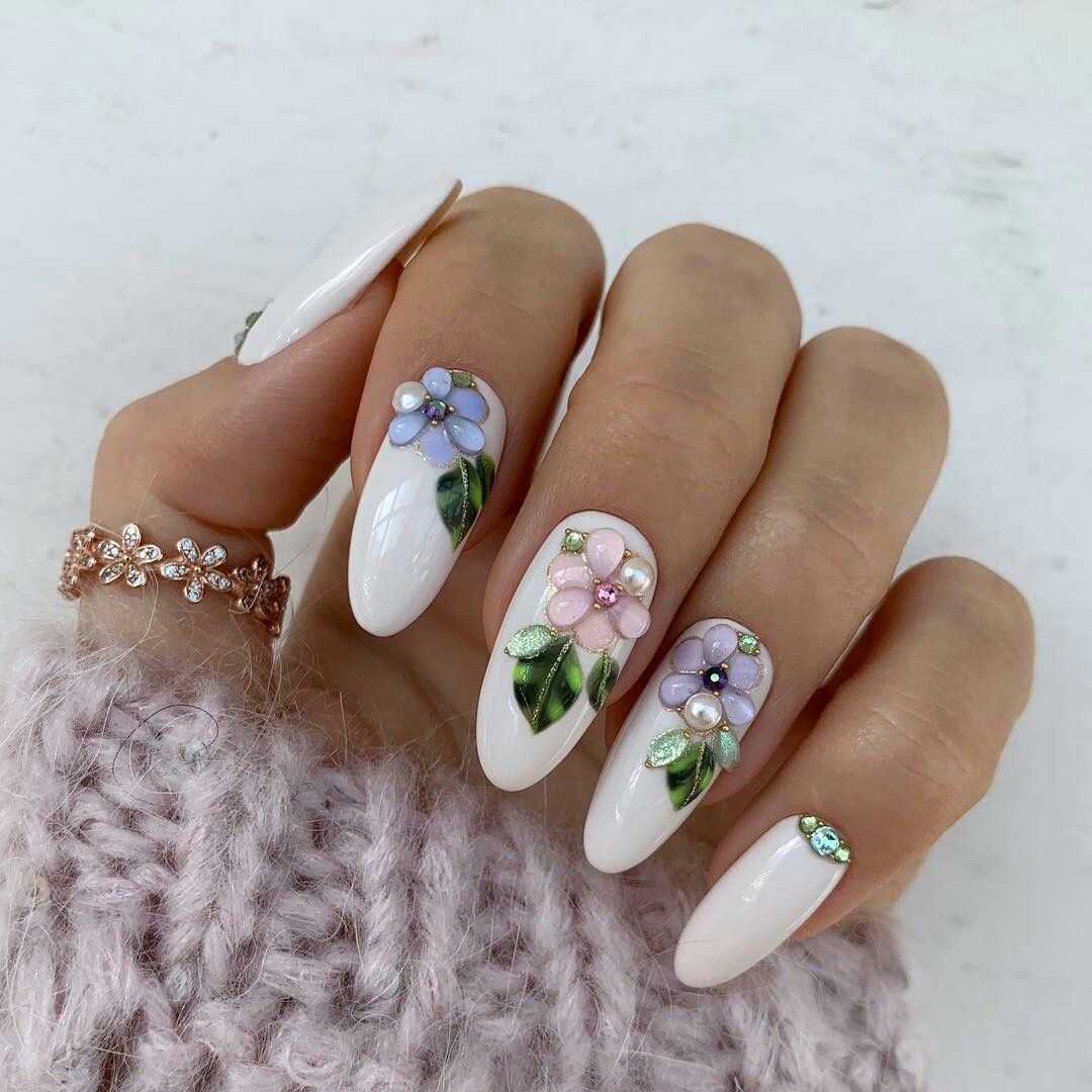 Не секрет, что дамы любят окружать свой быт цветами и оформление маникюра с разнообразными флористическими рисунками на длинных ногтях пользуются большой популярностью. Белый лак в качестве основы способствует воплощению множества идей. Покрытие одинаково красиво смотрится с нежными цветочками в технике «вуаль» и эффектно сочетается с многочисленными разноцветными изображениями веточек, листиков, бутонов и цветочных композиций. Флористика может оригинально сочетаться с графикой, дополнительно украшаться блестящими штрихами глиттера, стразами или бусинами. На длинных ноготках можно изобразить как аккуратные одиночные рисунки, так и оформить на пальчиках настоящую цветочную клумбу или панорамную композицию.