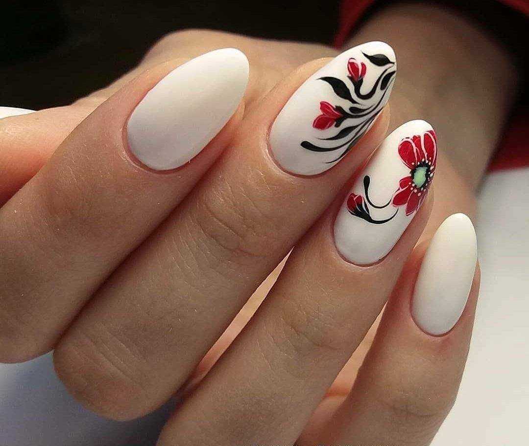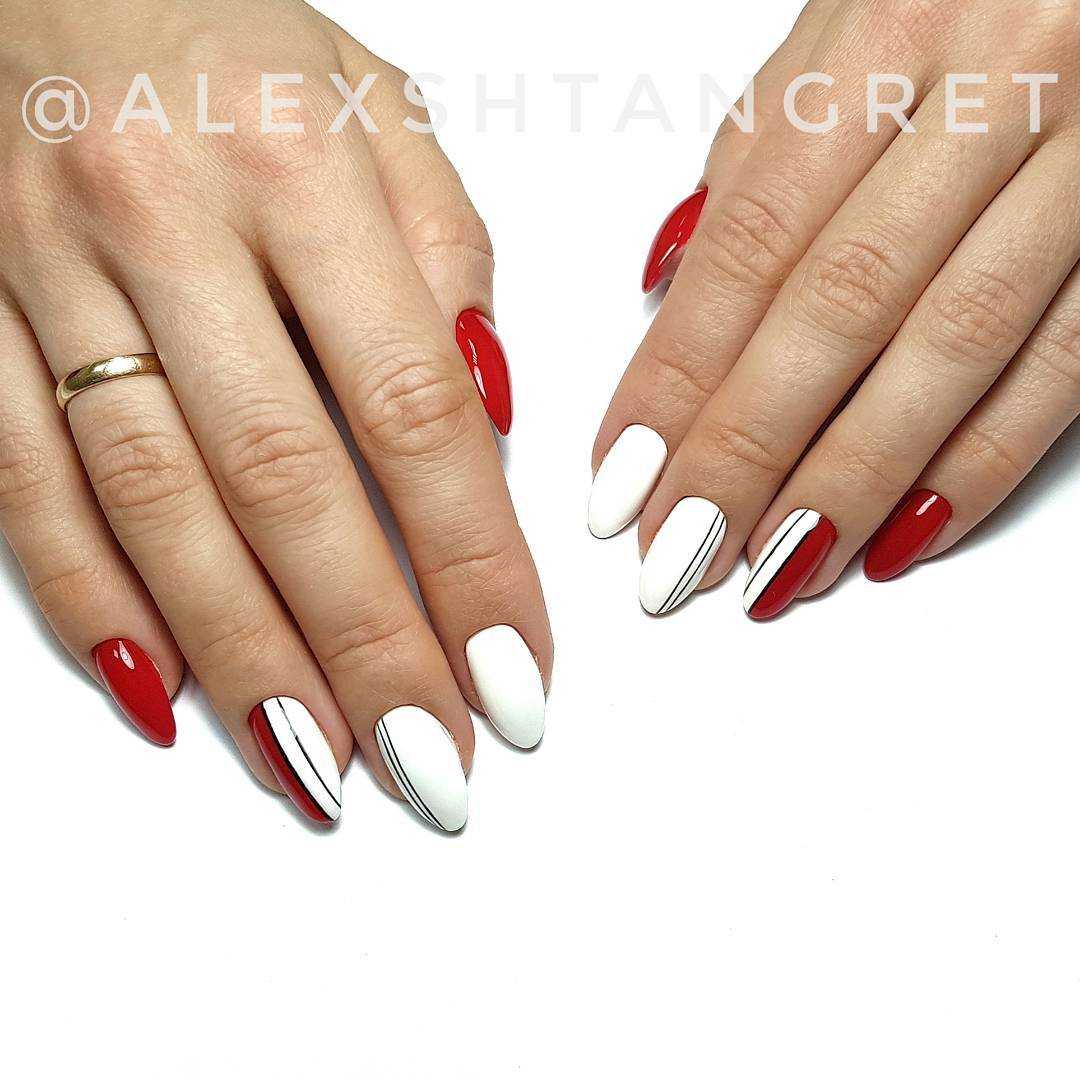 Белый с красным – это еще один вариант распространенного маникюра. Белые ногти с красными цветами или стразами, или белое и красное покрытия в качестве основных – это элегантно и завораживающе. Таким образом можно создать достойный праздничный или торжественный яркий и стильный маникюр.