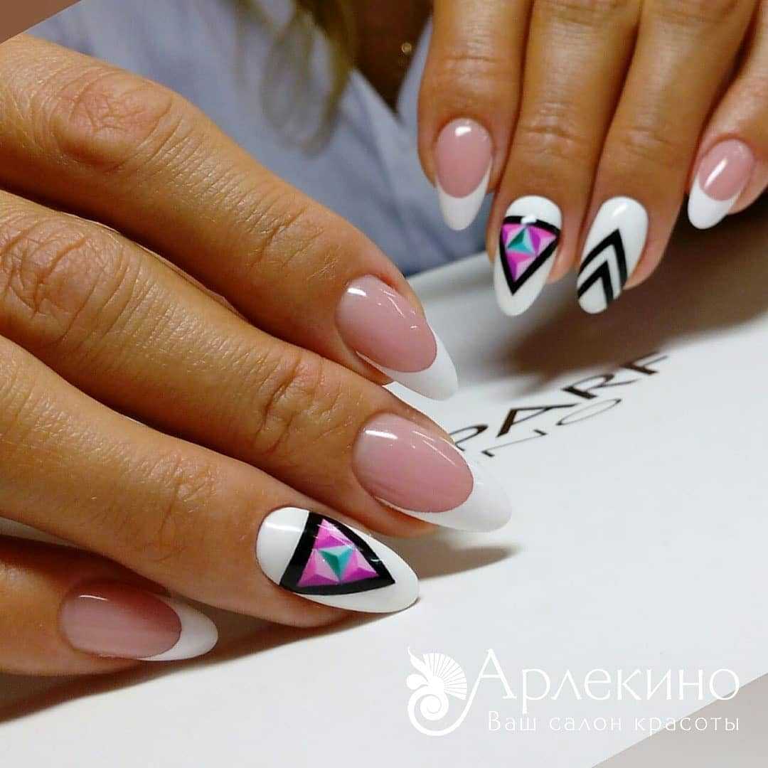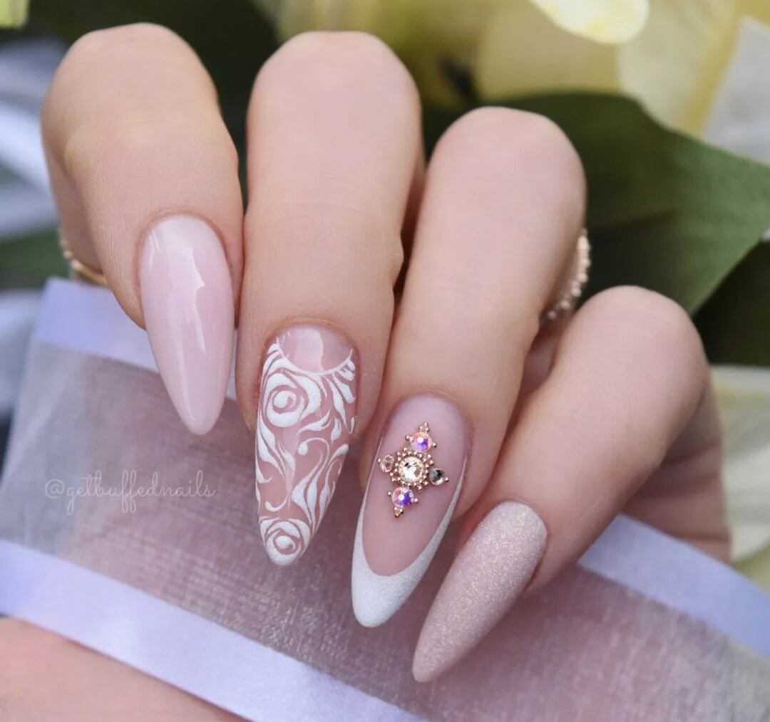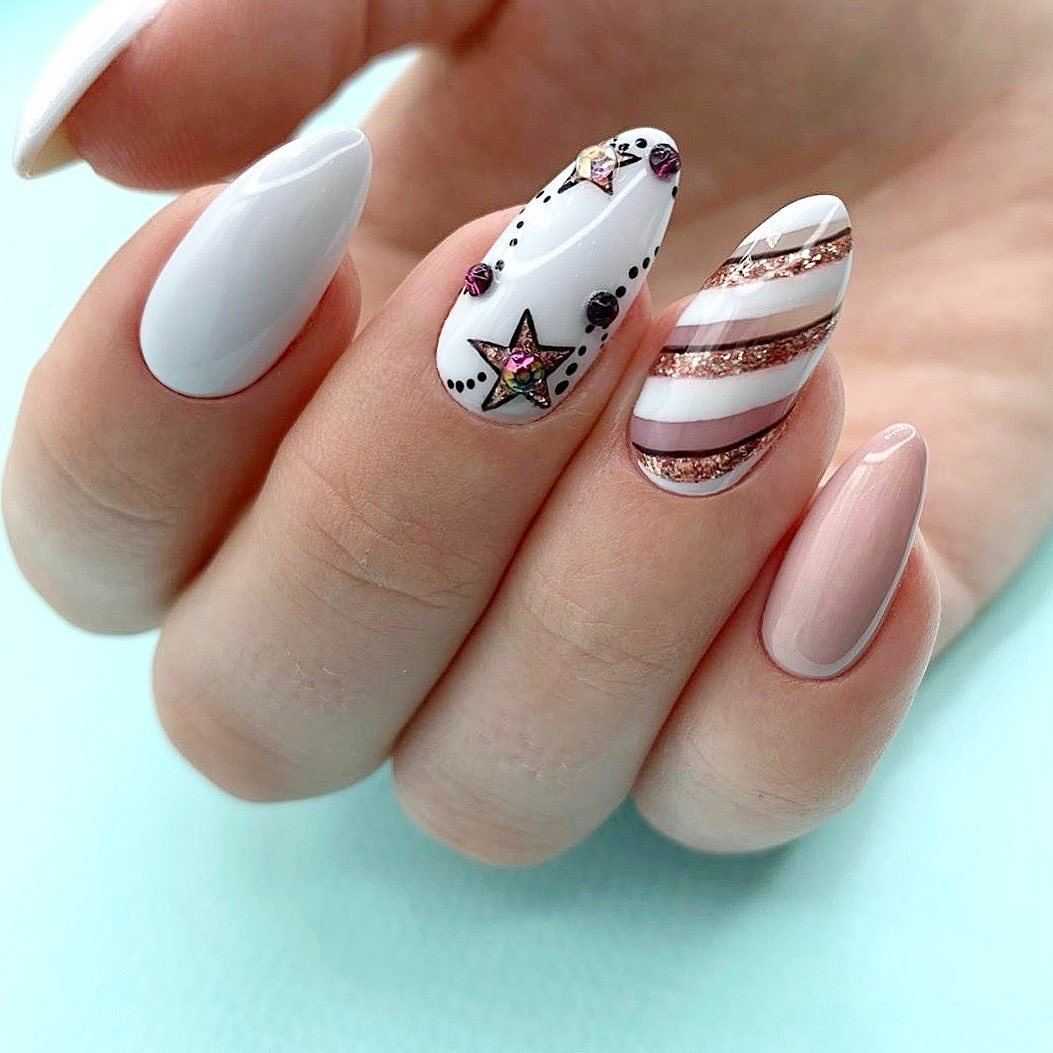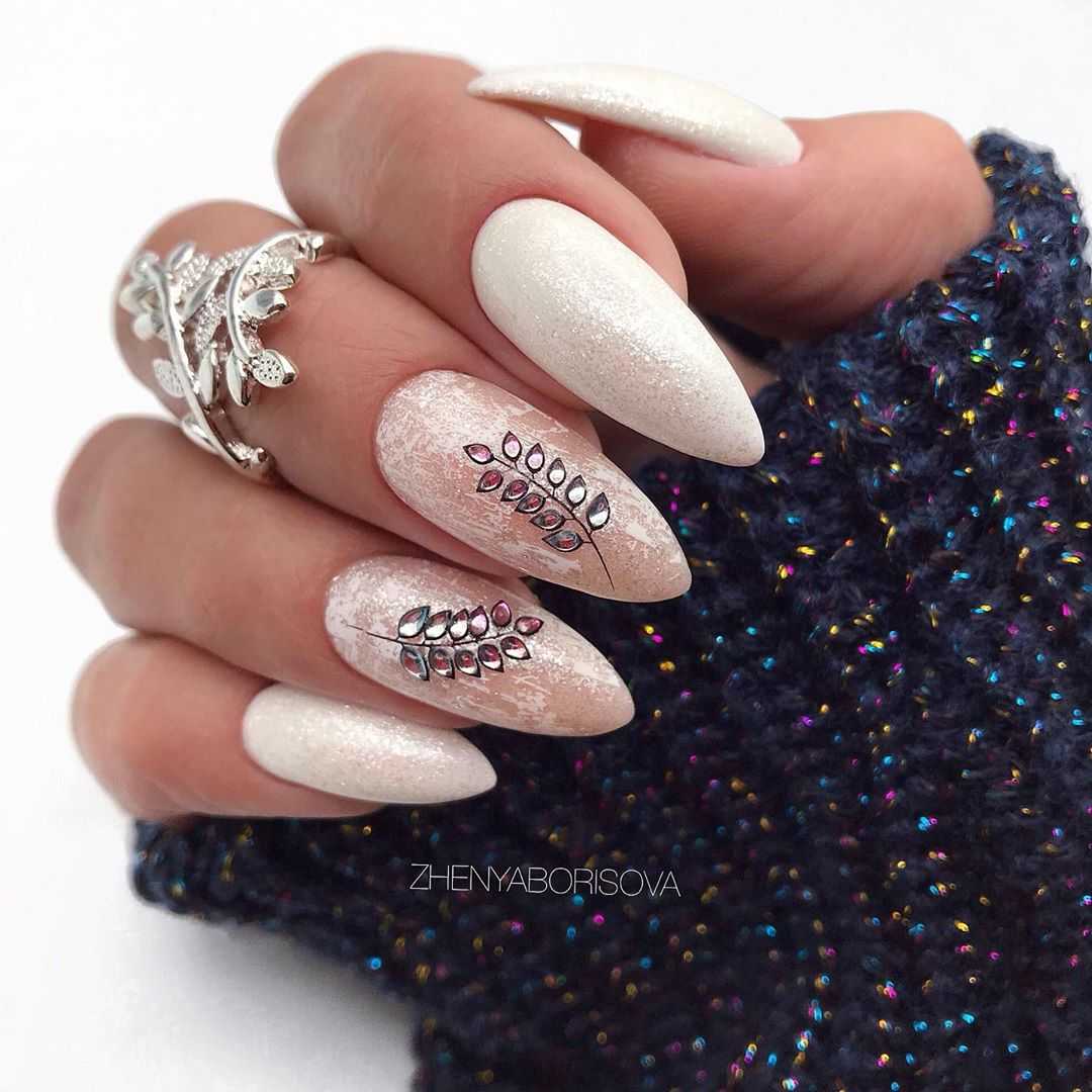 Для миндалевидных ногтей идеальны следующие элементы декора: камушки, фольга, пайетки, полосочки, рисунки. На миндалевидных ноготочках они выглядят элегантно и нежно.