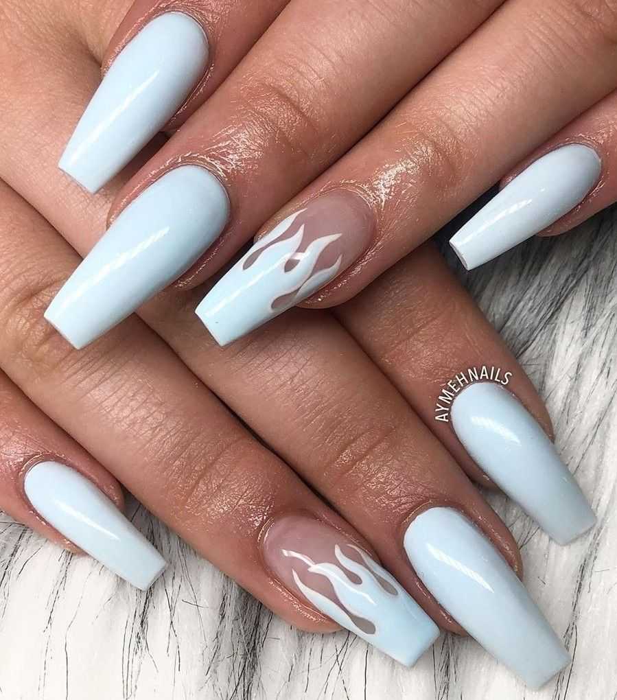 Еще один крутой тандем — белый и синий. Сине-белые ногти придадут образу нотку шика, женственности и элегантности. Нейл-мастера рекомендуют отдавать предпочтение средней длине и форме ногтей миндаль. Актуальны будут синие геометрические узоры на белом фоне. Также в моде френч с синей линией «улыбки» и маникюр в стиле «negative space». Если вам надоел классический френч, попробуйте лунный дизайн. В синем цвете он невероятно красив.