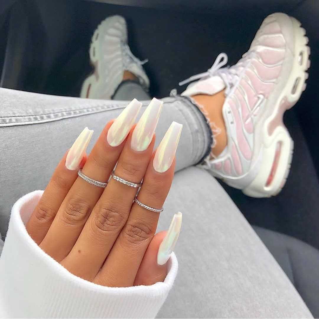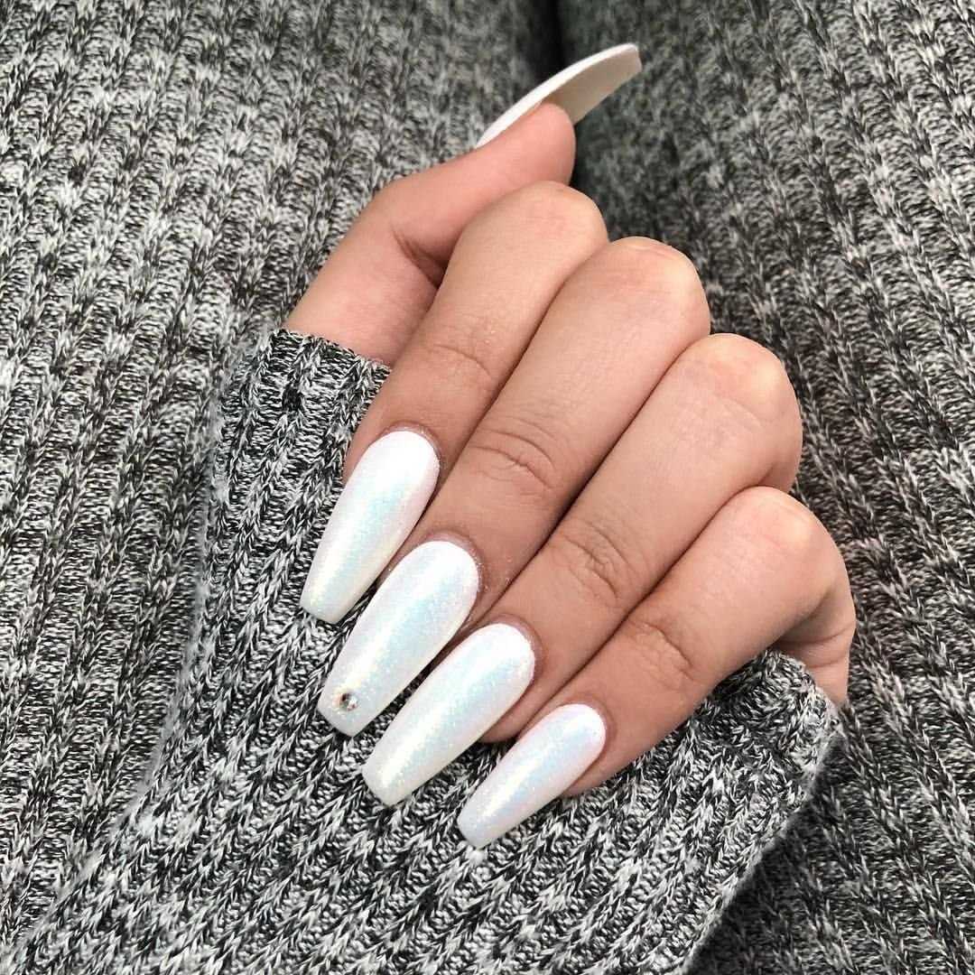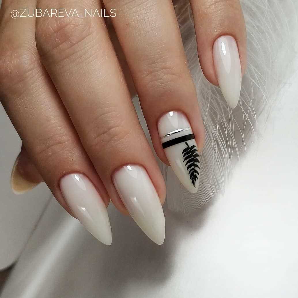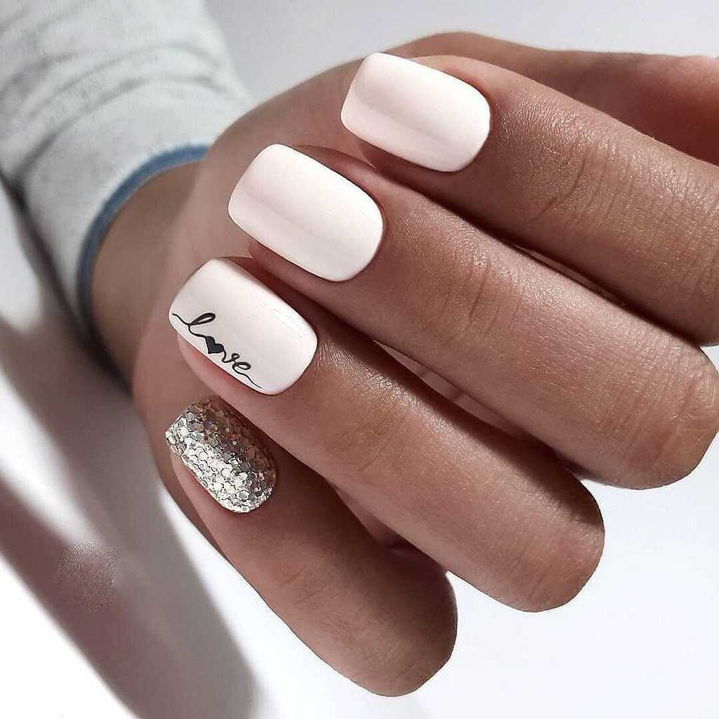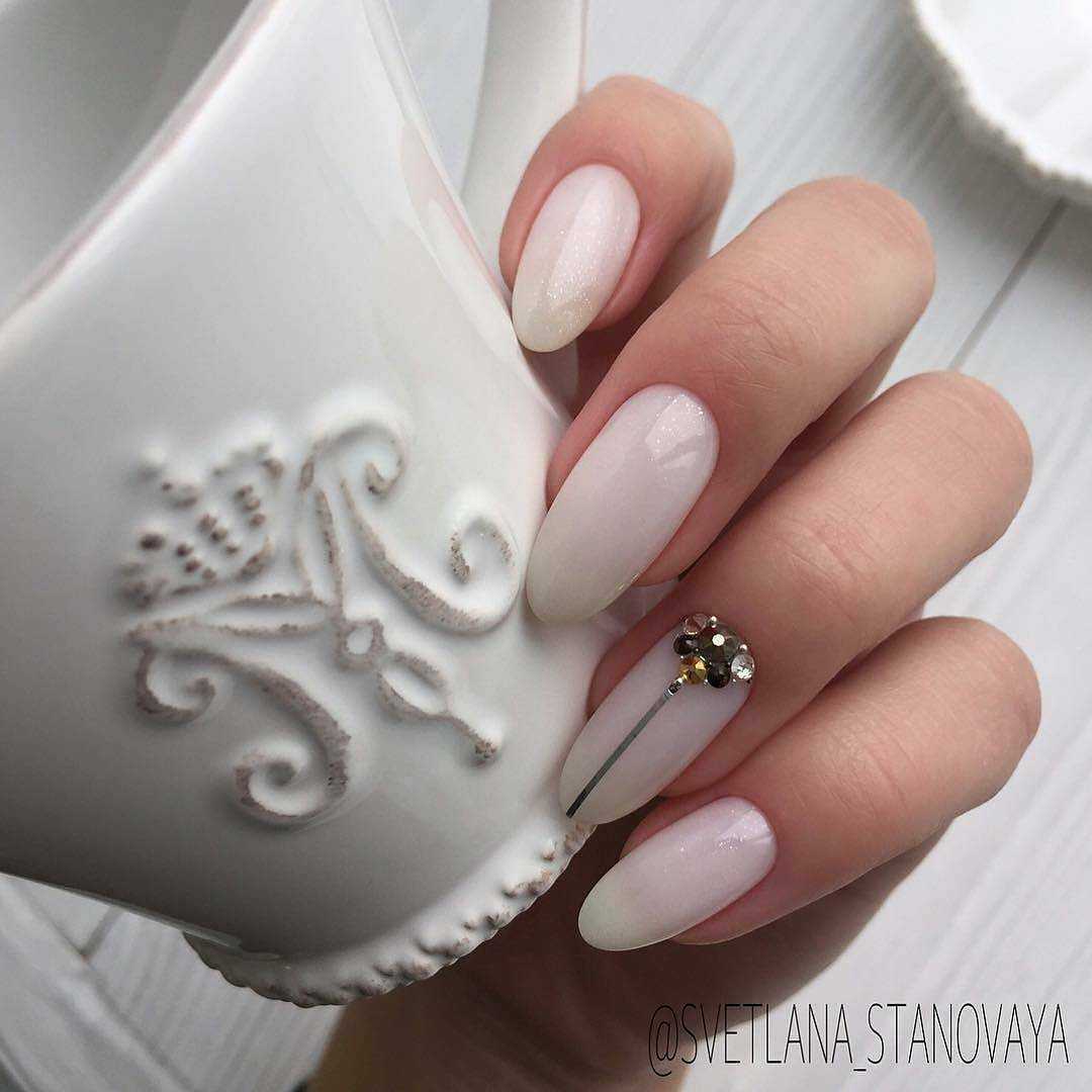 Нежные натуры любят делать молочно-белый маникюр. Такой вариант универсален, с ним можно отправляться на любое мероприятие. Дизайн подойдет под спортивный костюм, деловой наряд и даже свадебное платье. Попробуйте добавить к нему немного блесток. Так ваш маникюр приобретет более изысканный вид.