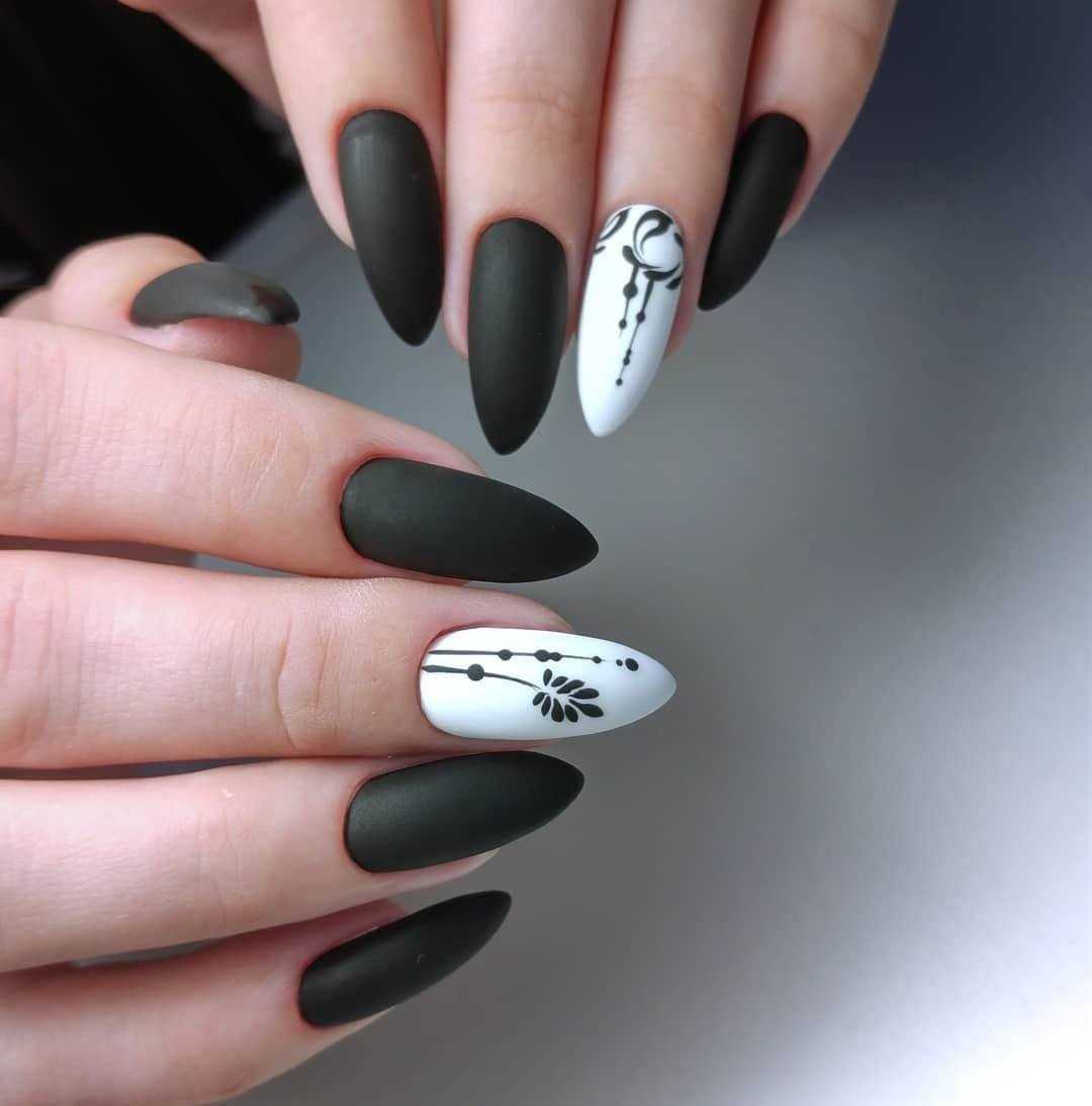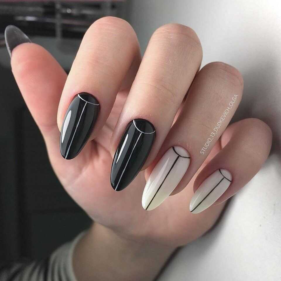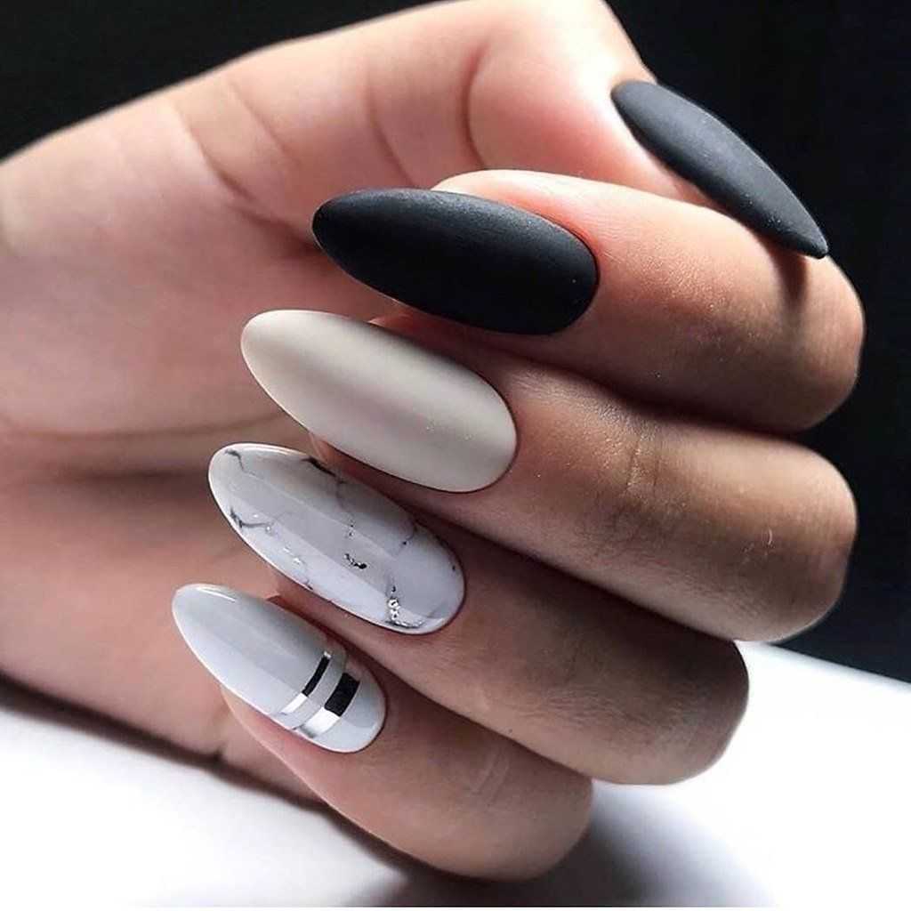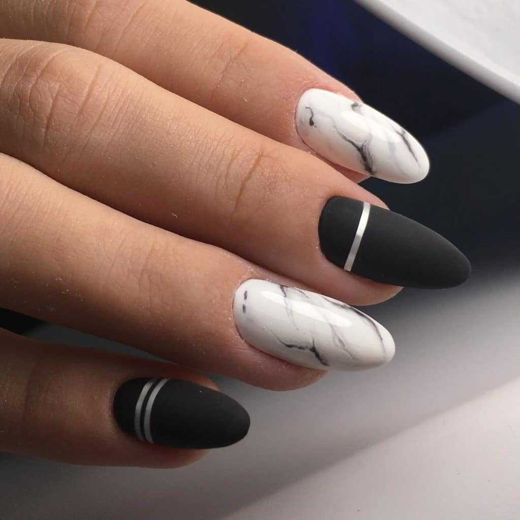 Черно-белый маникюр — один из любимых дизайнов ногтей многих девушек. Этот вариант оформления ноготков имеет множество текстурных вариаций, которые помогут подчеркнуть темный оттенок кожи, сделают ручки ярче и элегантнее. Также такой дизайн поможет придать любому образу одновременно дерзкий и современный вид. Круче всего смотрится на длинных острых ногтях. Можно добавить на некоторые ногти стразы, это поможет создать более праздничный дизайн.