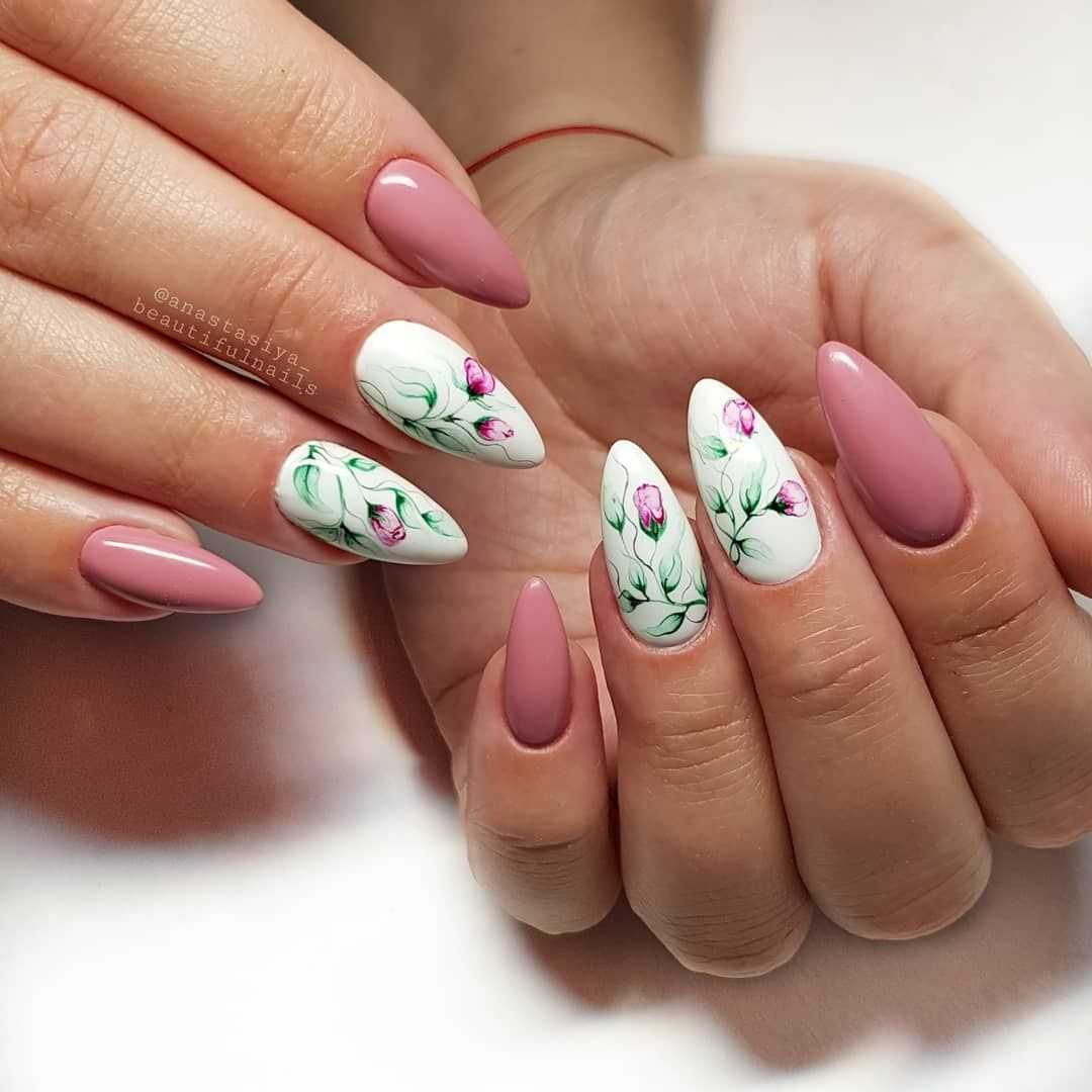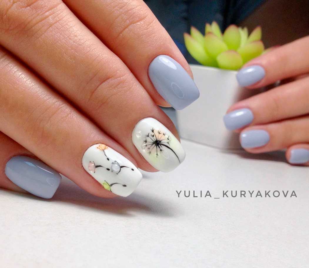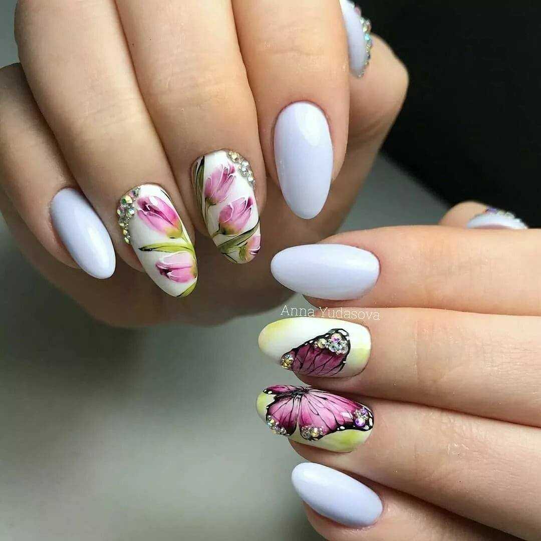 Дизайн цветочный. Такой маникюр подойдет для весенне-летнего периода. Стиль оформления цветов может быть различным от натурального до клип-арта или стилистического.