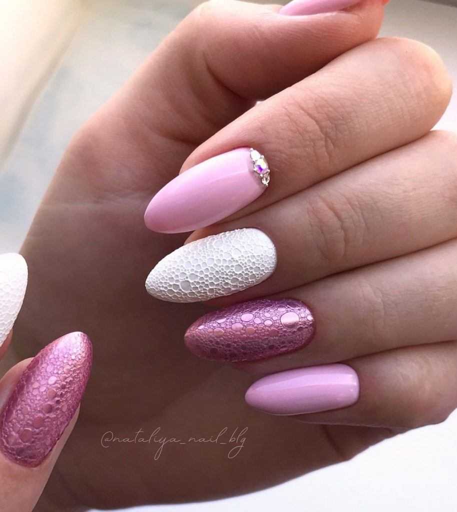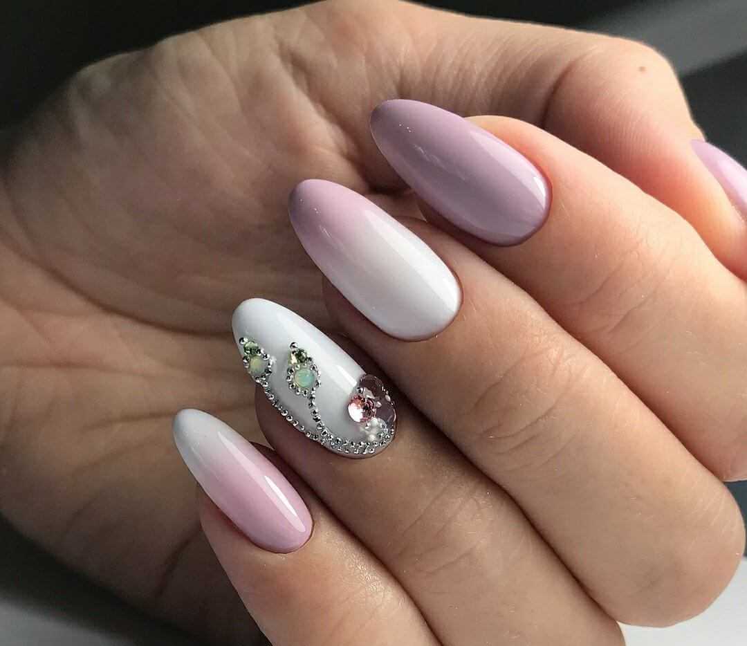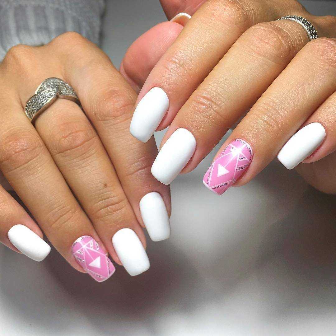 Дуэт розового и белого — фаворит многих красоток. В данном случае актуальна техника омбре. Плавные переходы от одного оттенка к другому смотрятся волшебно. Можно также добавить цветы, серебряные полосы, паутинку или рисунки в виде перьев. В любом случае такой дизайн не останется без внимания.