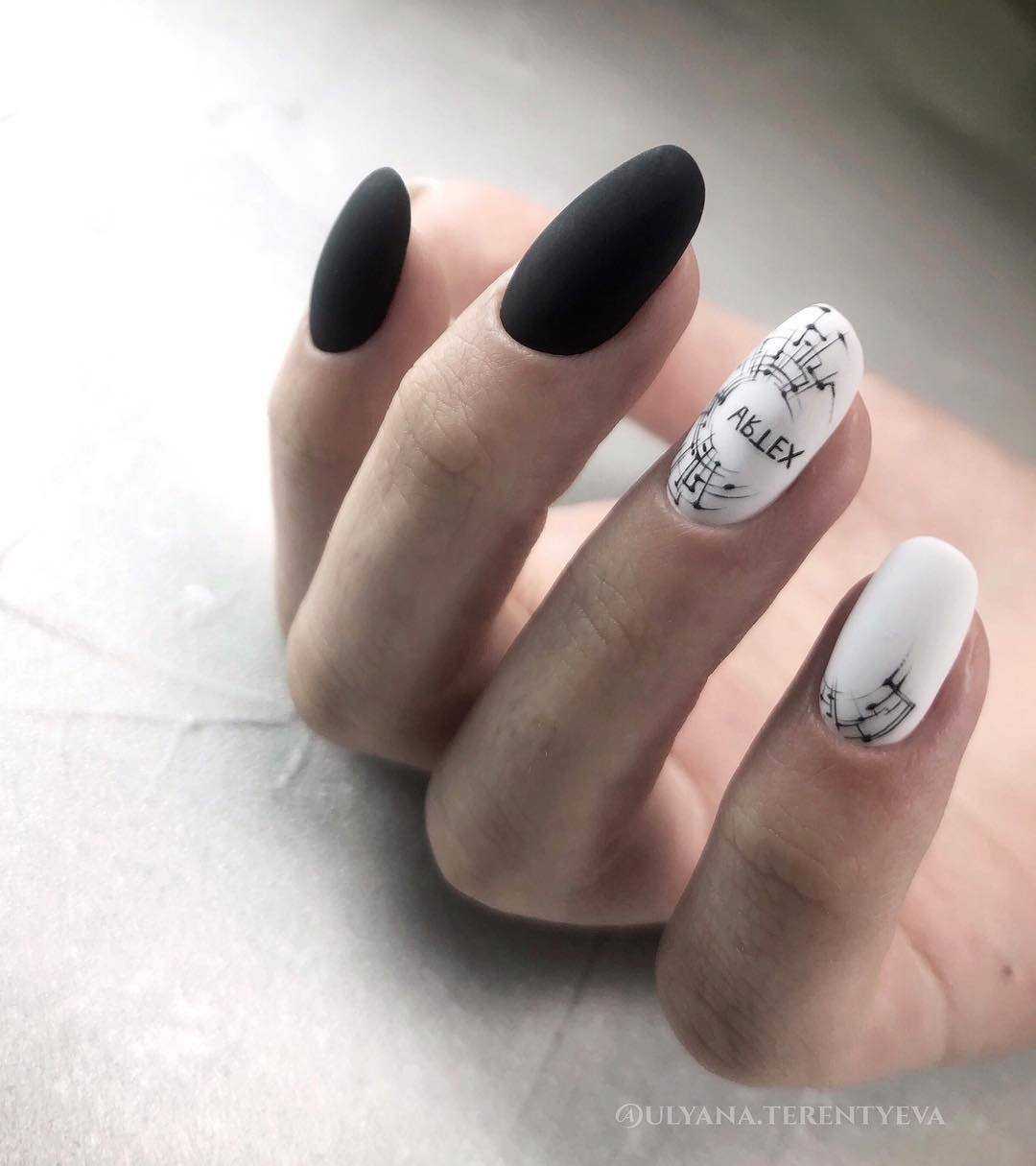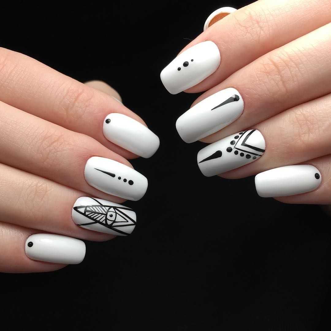 Черно-белый маникюр также часто выбирают модницы для создания лука на каждый день. На белый фон может быть нанесен черный рисунок, чаще всего это лишь его контур, геометрический узор или орнамент.