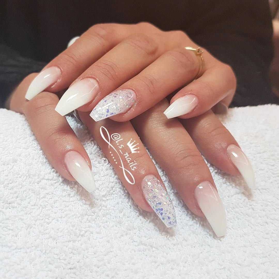 Такой красивый и изящный прием никогда не утратит своей популярности среди девушек, которые ценят элегантность и стиль в маникюре. Актуальные тренды разделились на два варианта омбре – градиентный эффект белого лака с последующим украшением блёстками, а также растяжка сверкающего декора на готовом светлом покрытии. В обоих случаях можно использовать блёстки разного размера и формы для максимальной выразительности дизайна.