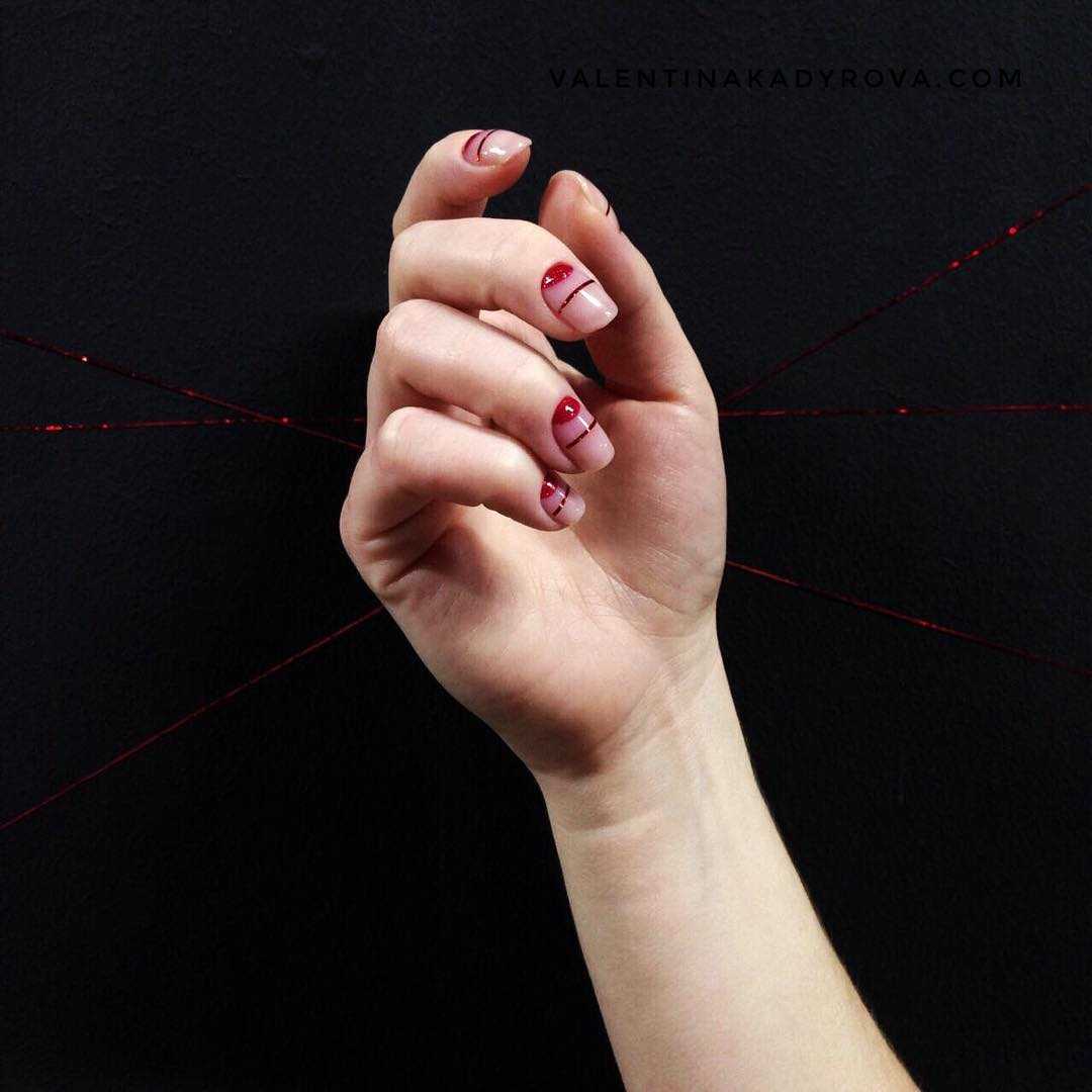 - Достаточно широких полос вдоль или поперек ногтя и черный и красный цвета уже заиграют вместе по-новому.