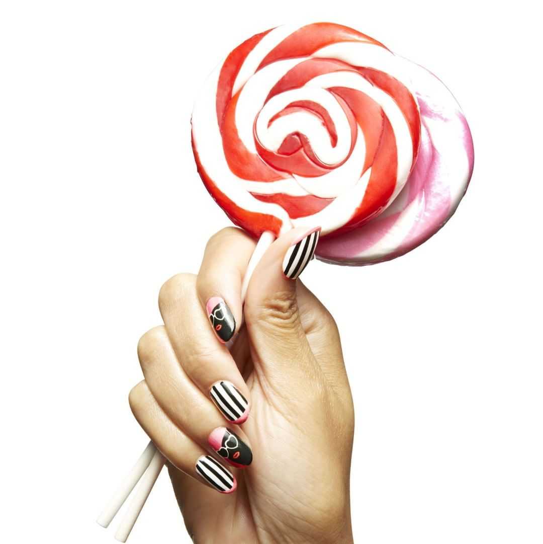 Абсолютно девчачий вариант — маникюр розовый с белым и черными полосками. Дня него срабатывают «ограничения по возрасту», как бы это печально не звучало, но подобный дизайн ногтей смотрится уместно только на ручках совсем юных девчушек. Именно здесь лучше всего рисовать темные линии, украшать их камушками-блестками и радоваться, как ребенок, получившемуся нежному розово-белому нейл-дизайну. Рекомендуем позаботиться о качественной базе и топовом покрытии, чтобы ваши шедевры на ноготках просуществовали без заломов и сколов как можно дольше. Блестки также уместны в таком маникюре.
