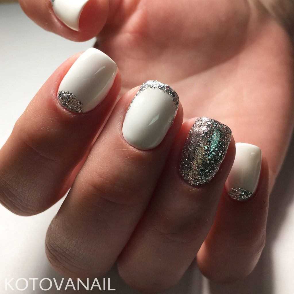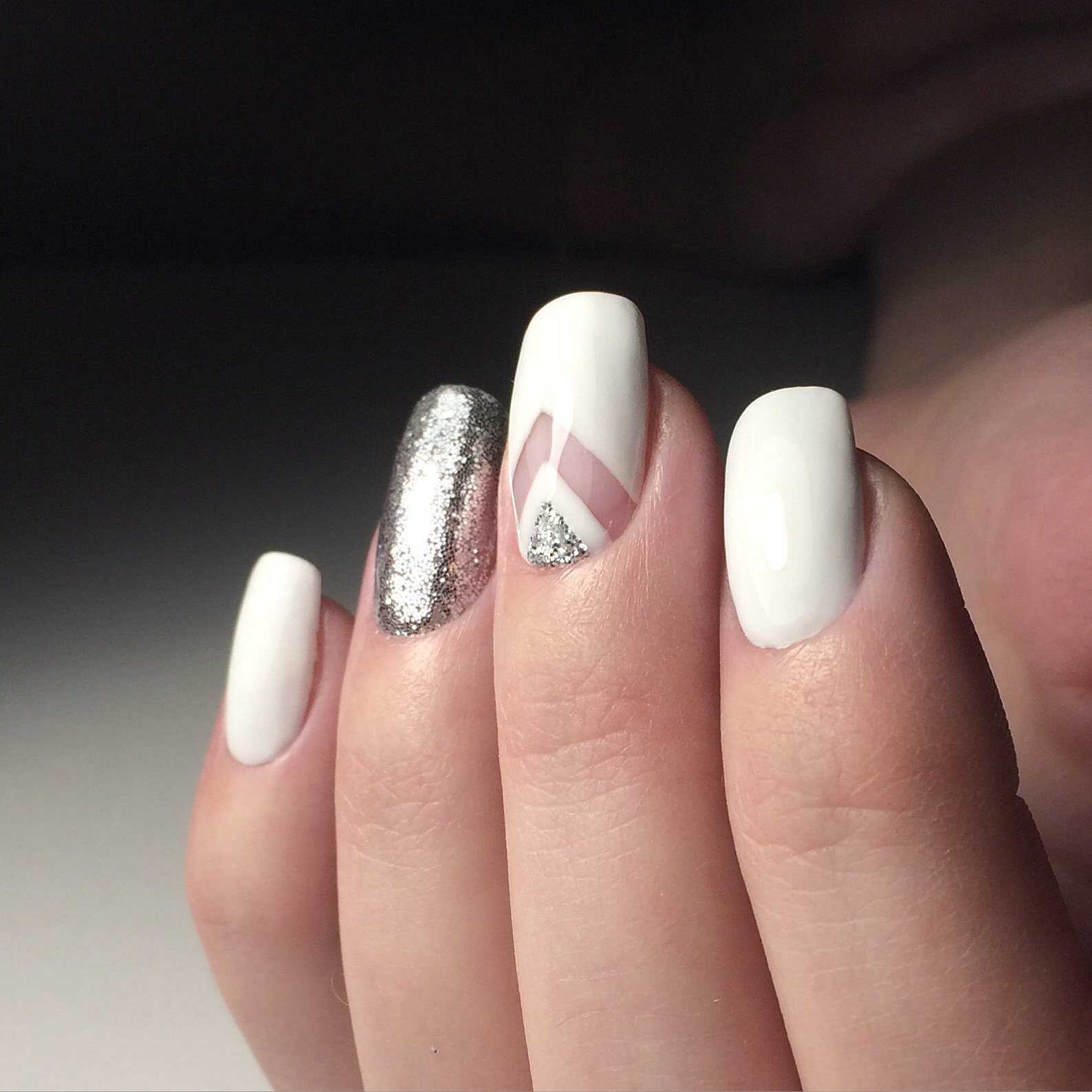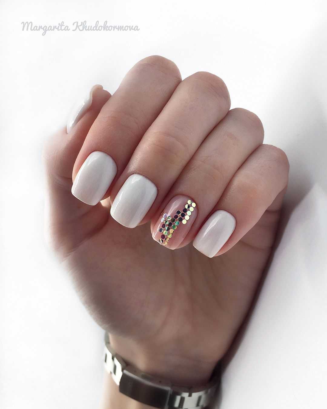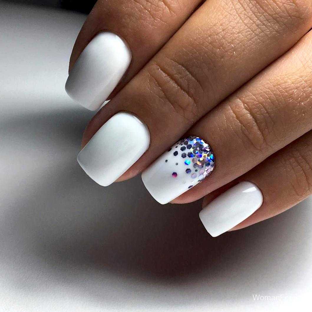 Белый цвет визуально увеличивает пространство ногтевой пластины, поэтому он отлично подойдет для декора коротких ноготков. В тренде однотонное покрытие белым цветом, дизайн с растяжкой блестками, использование гель-лаков, в состав которых входит шиммер или глиттер.