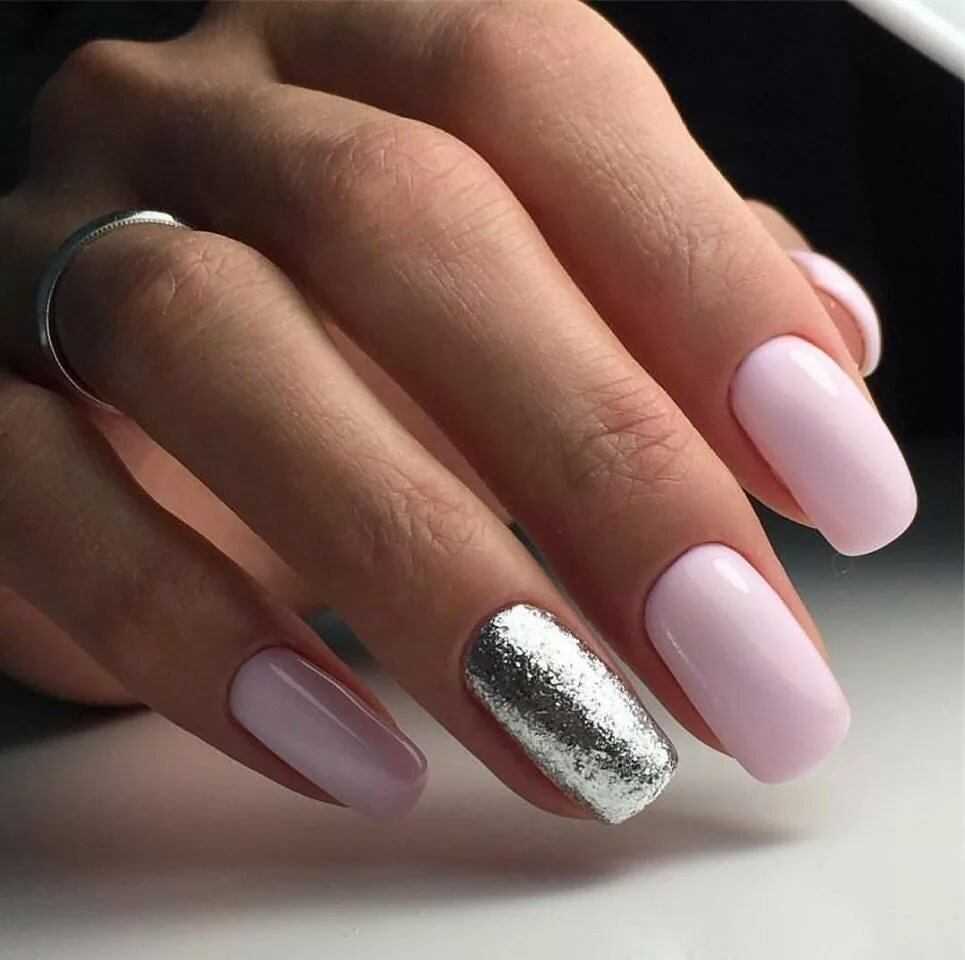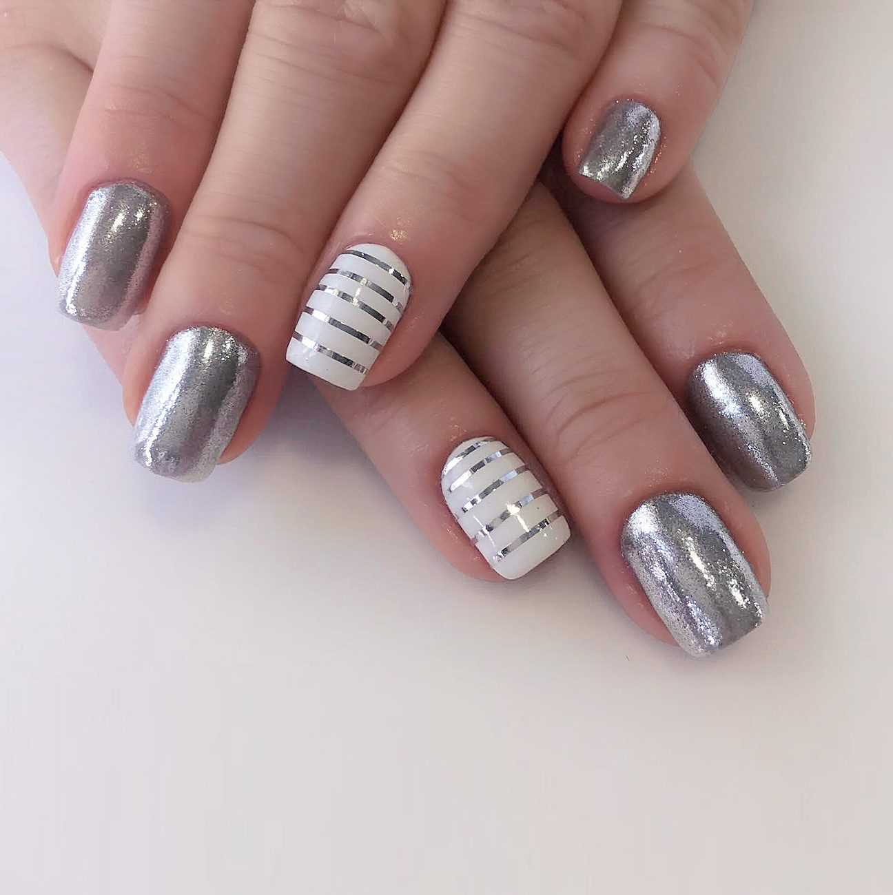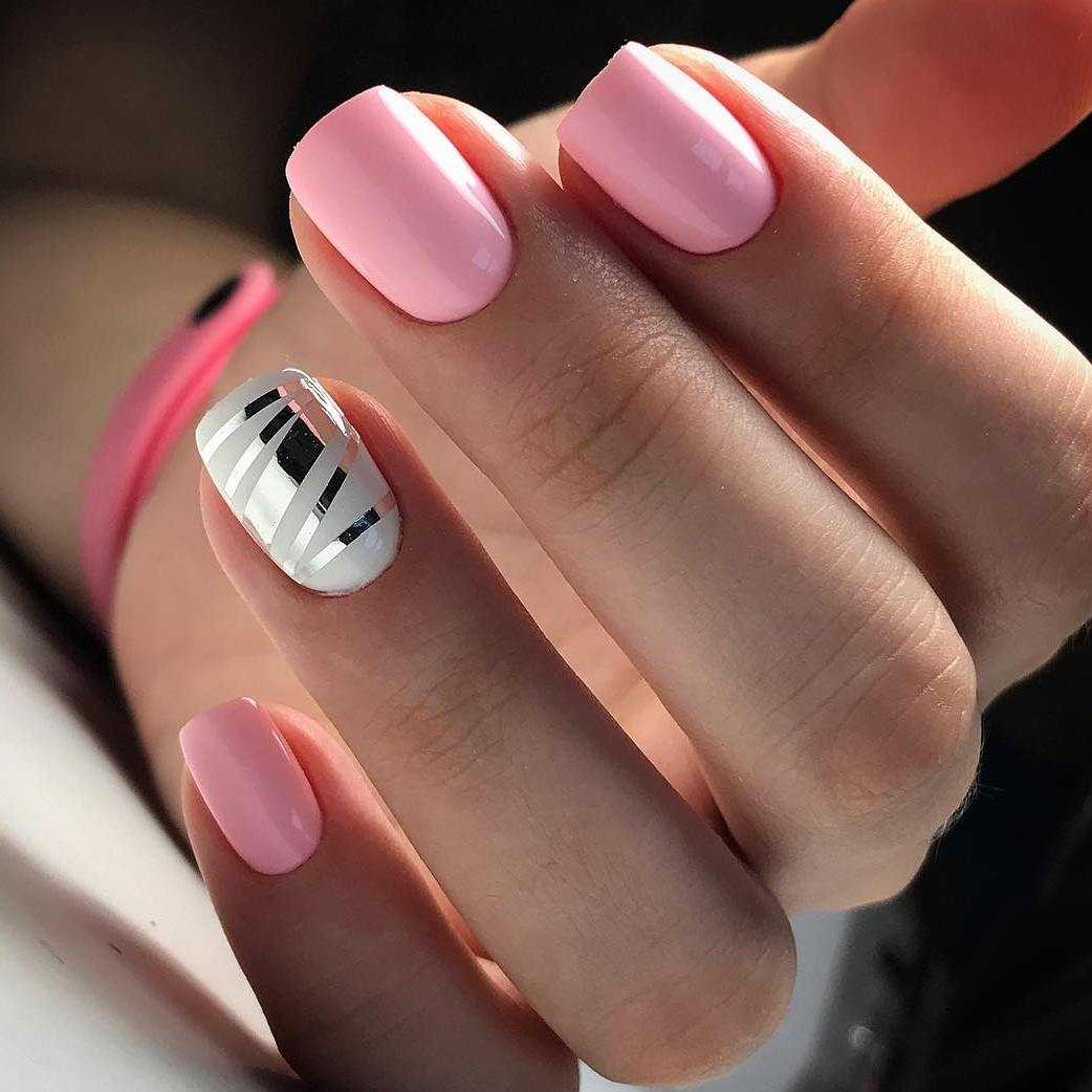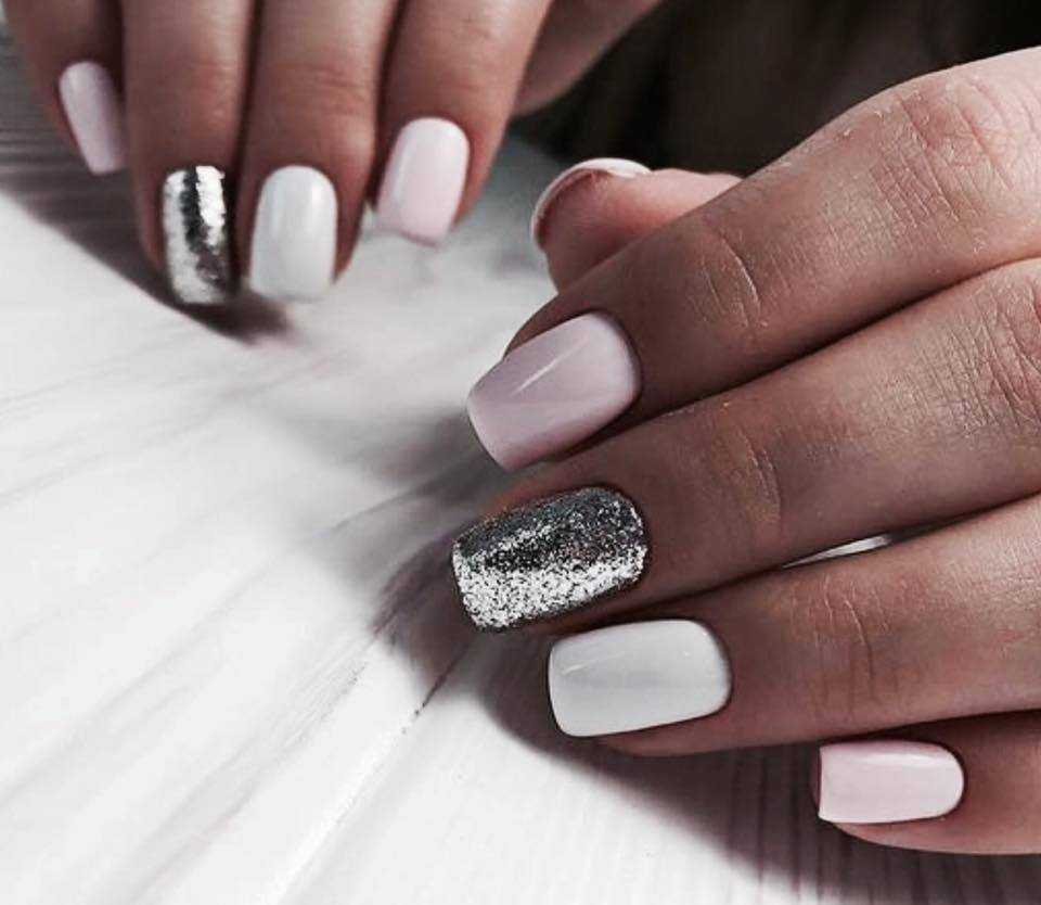 Не ограничивайтесь только однотонными нейл-артами. Добавьте в дизайн кружевной узор, выделите прикорневую зону. Используйте в качестве дополнения розовый цвет. Сочетание белого, розового и серебряного оттенков смотрится на ногтях благородно и очень сдержанно. Пример такого нейл-арта вы можете видеть на фото ниже.