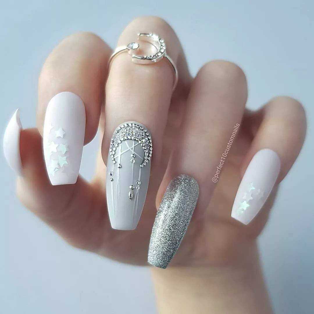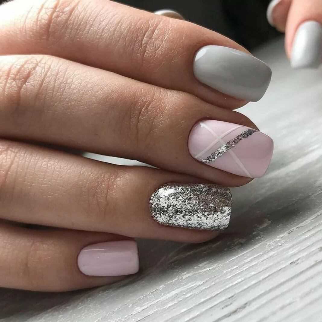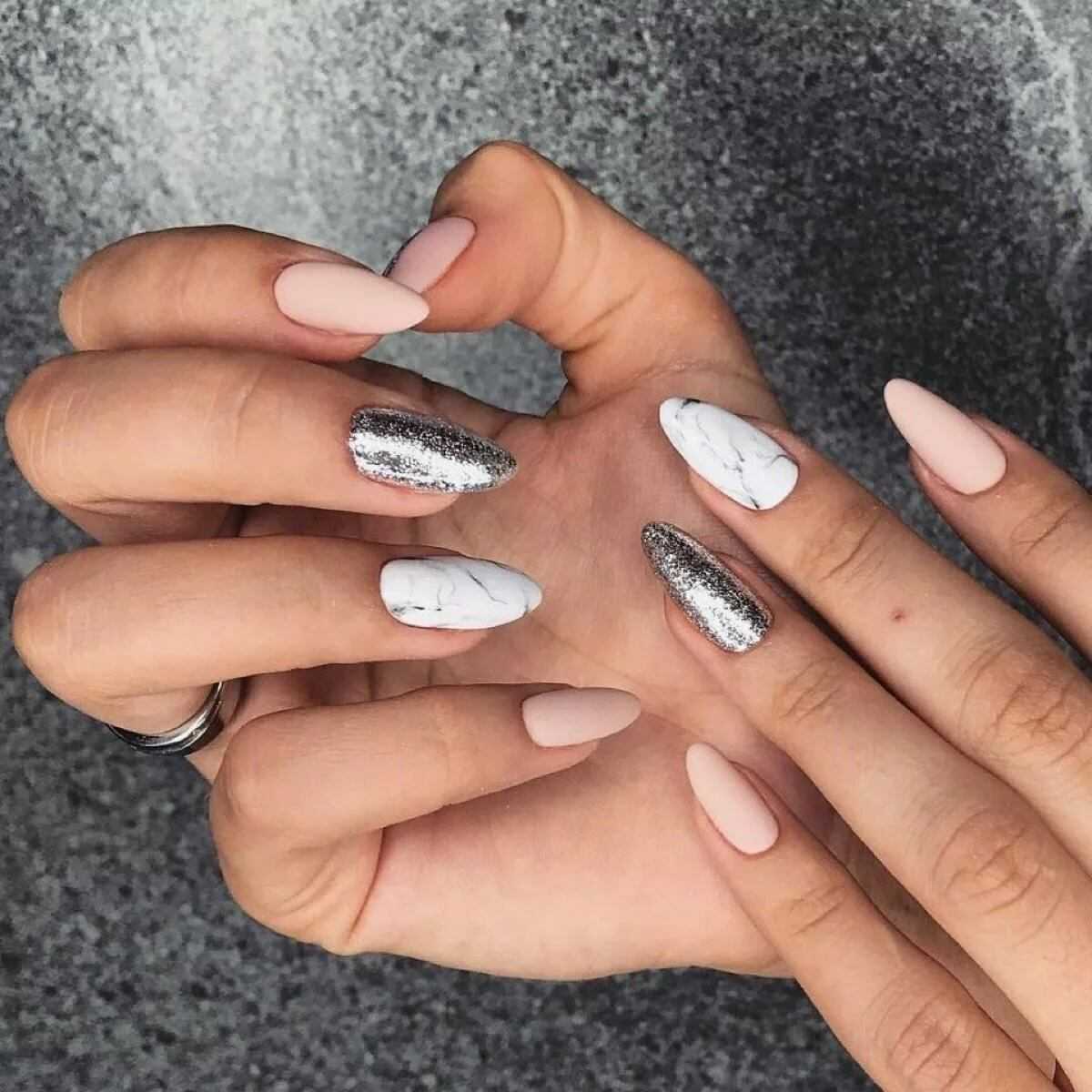 Не ограничивайтесь только однотонными нейл-артами. Добавьте в дизайн кружевной узор, выделите прикорневую зону. Используйте в качестве дополнения розовый цвет. Сочетание белого, розового и серебряного оттенков смотрится на ногтях благородно и очень сдержанно. Пример такого нейл-арта вы можете видеть на фото ниже.