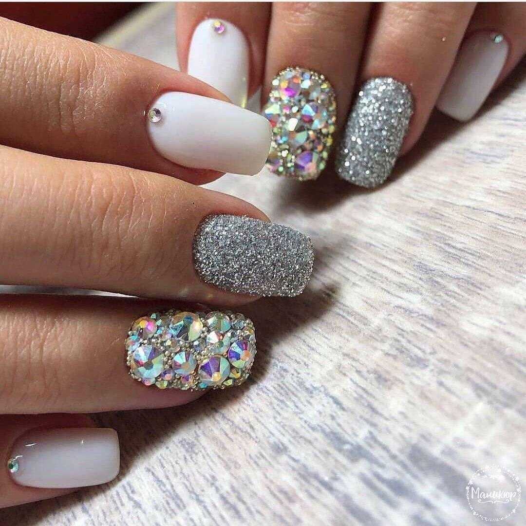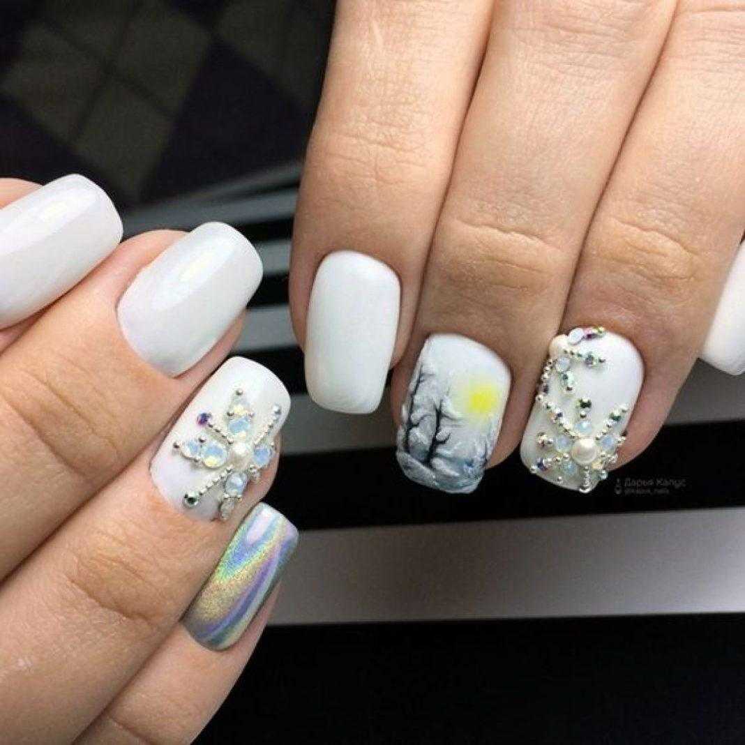 В дизайне новогодних ногтей видно, что блеска много не бывает. Например, добавить в дизайн объемные фигуры в виде зимних украшений, геометрии, сердечка, полосок или просто крупных страз. Сделать маникюр очень необычным, но визуально продуманным.