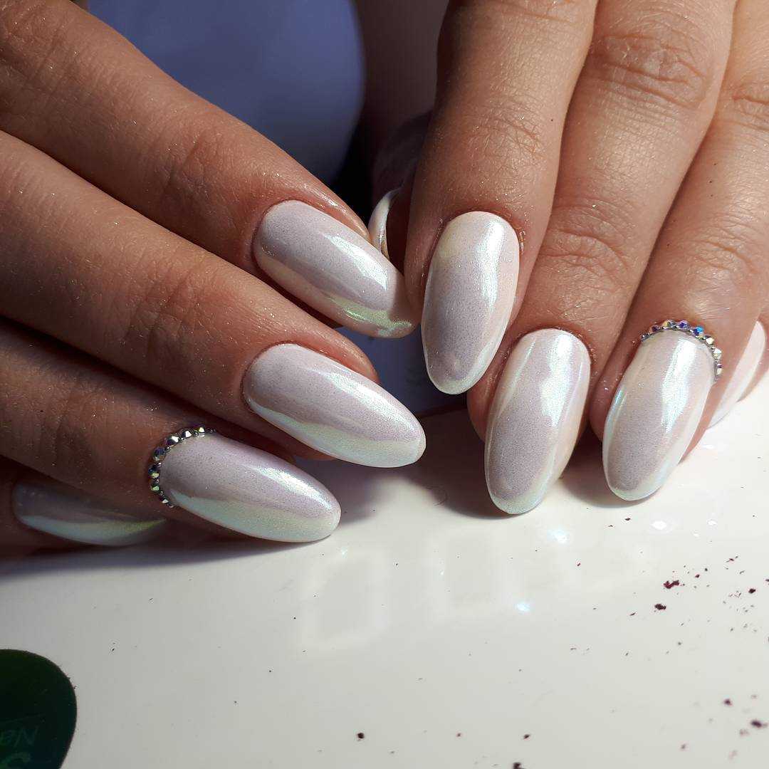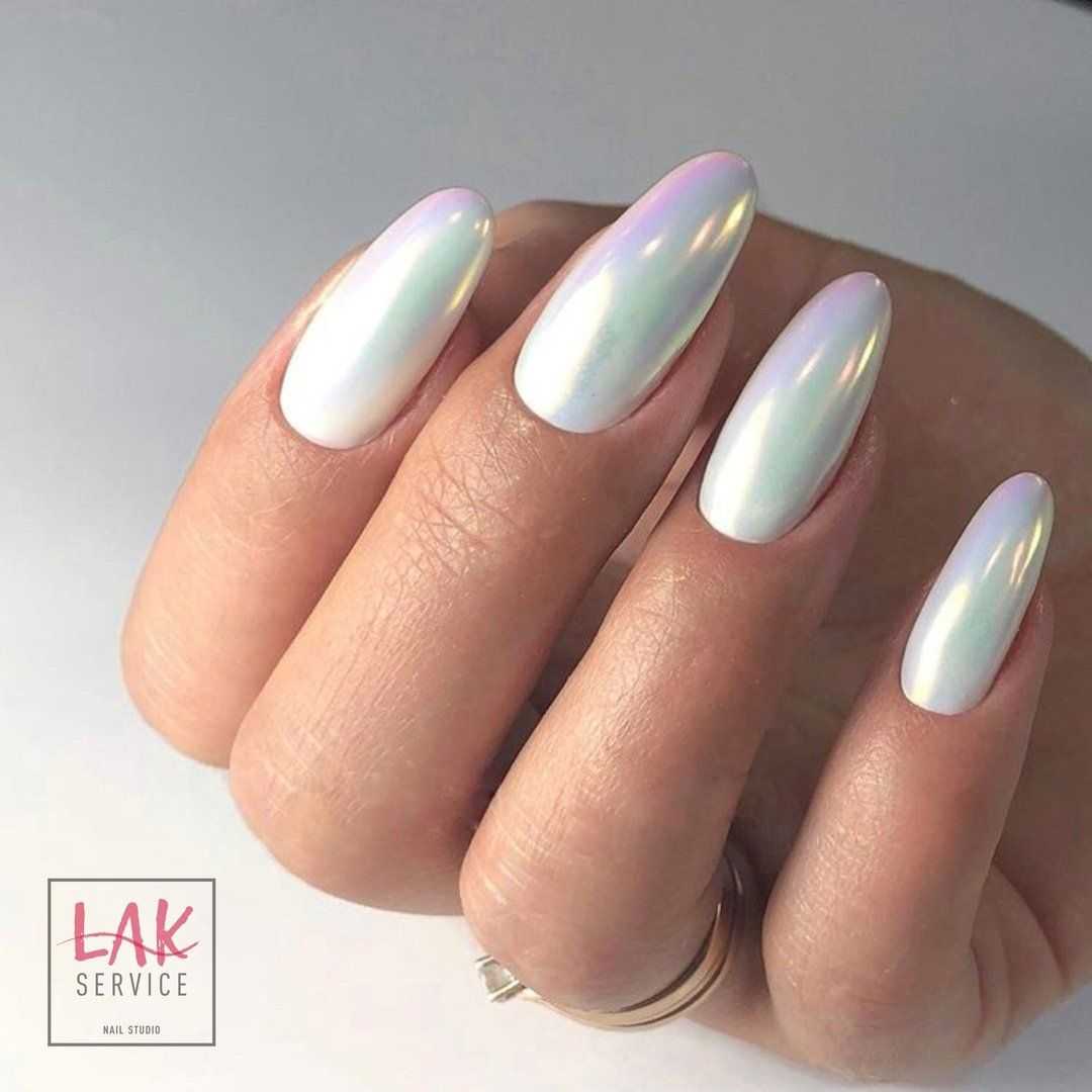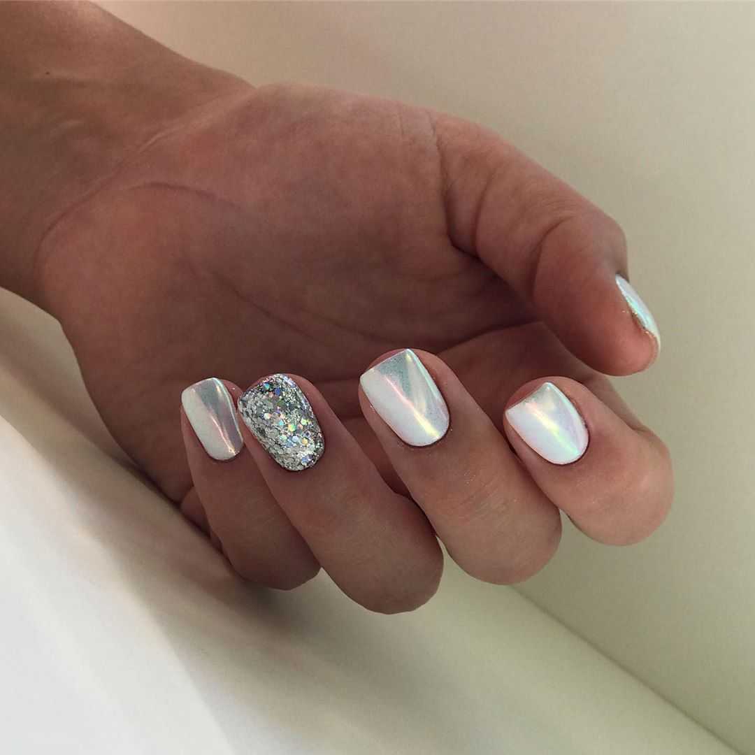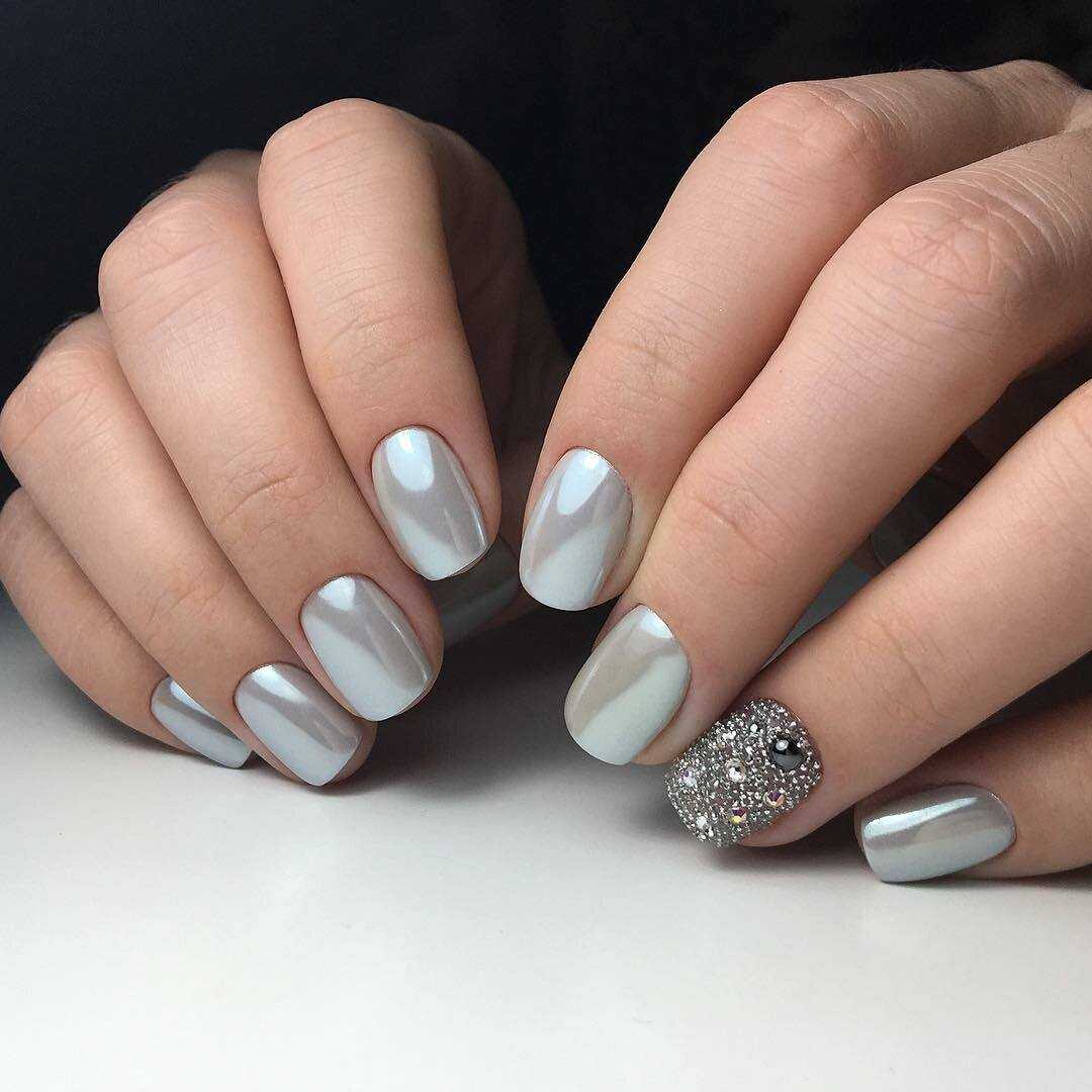 Для новогодней ночи лучше всего подойдет зеркальная втирка – она привлечет внимание к вашим ноготкам и отлично дополнит вечерний наряд с пайетками. На светлых и пастельных оттенках лака очень нежно будет смотреться перламутровый эффект