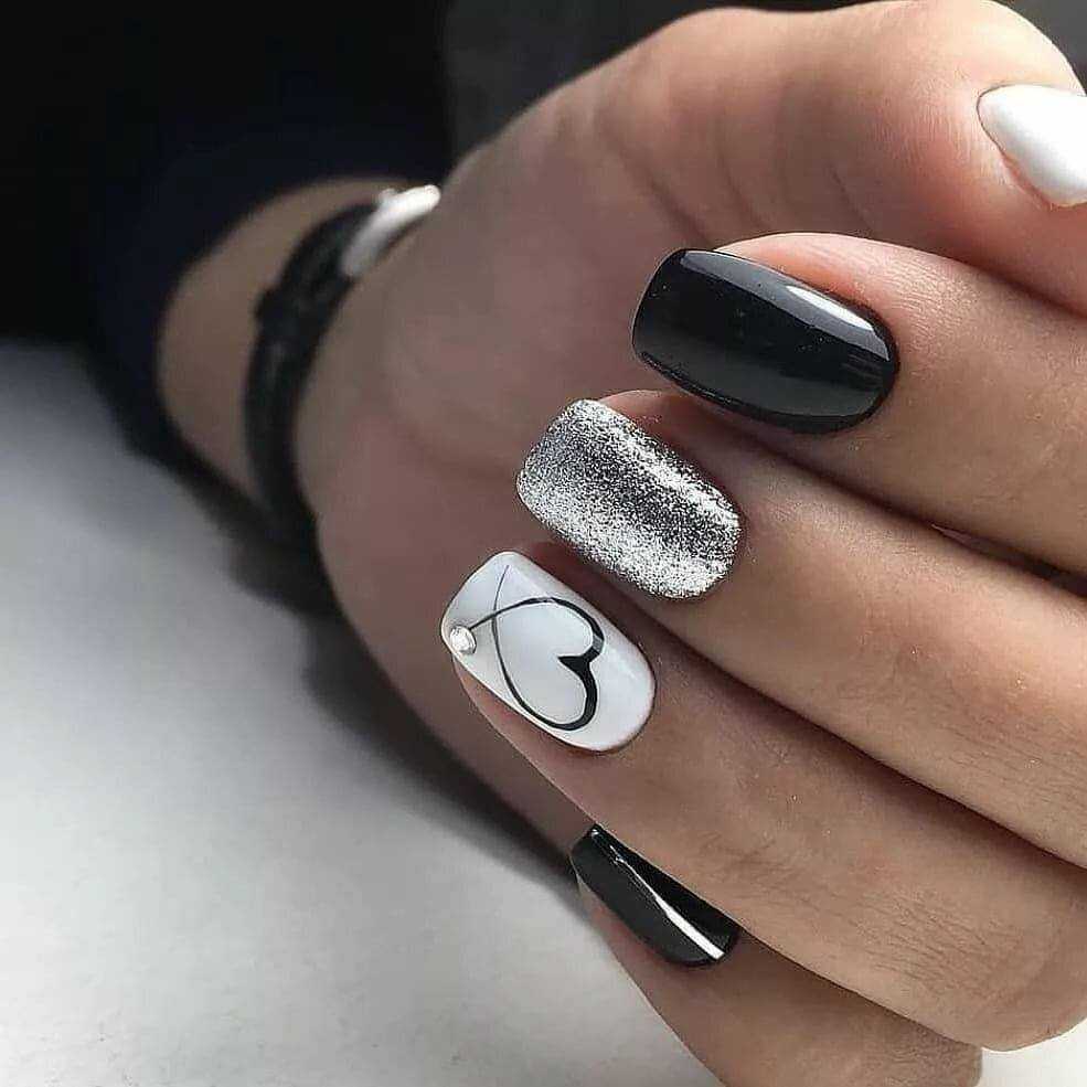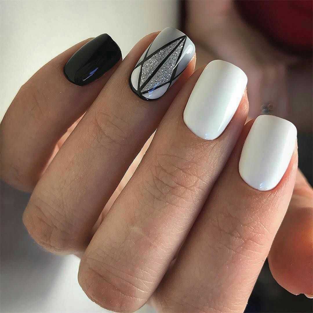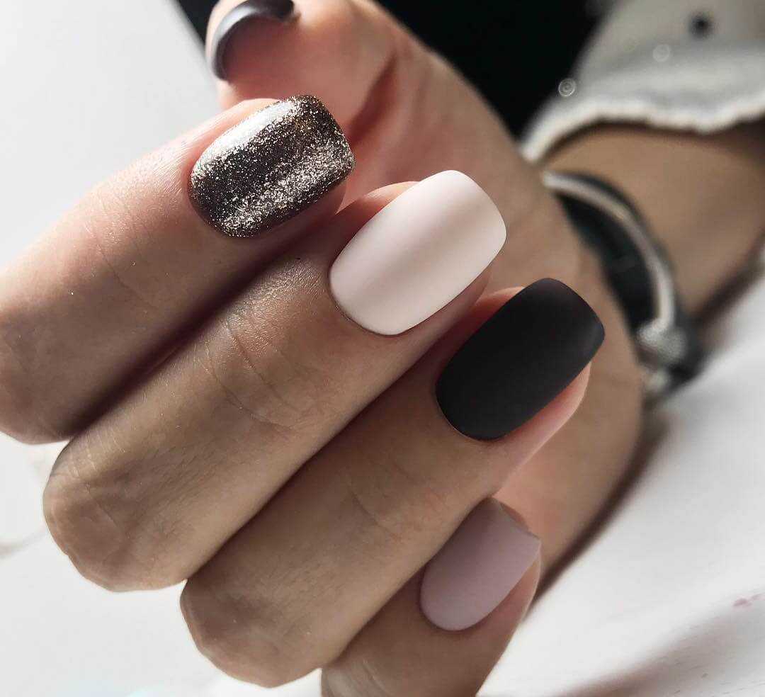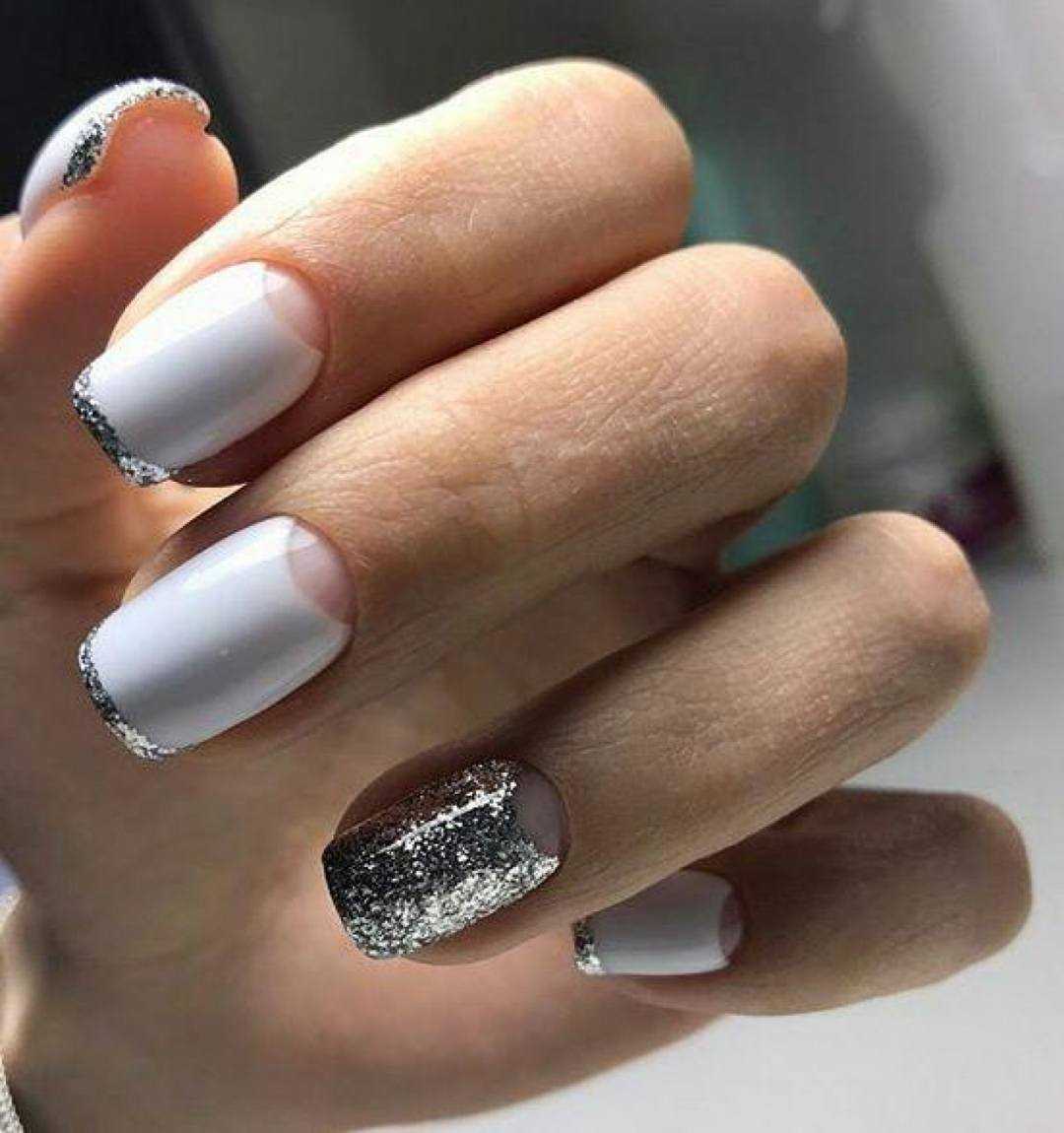 Ахроматические цвета — не имеют оттенка. Поэтому, делая маникюр в этих цветах, больше внимания уделите фактурам. Примером может послужить новогодний черный маникюр с фольгой или белый френч с блестками.