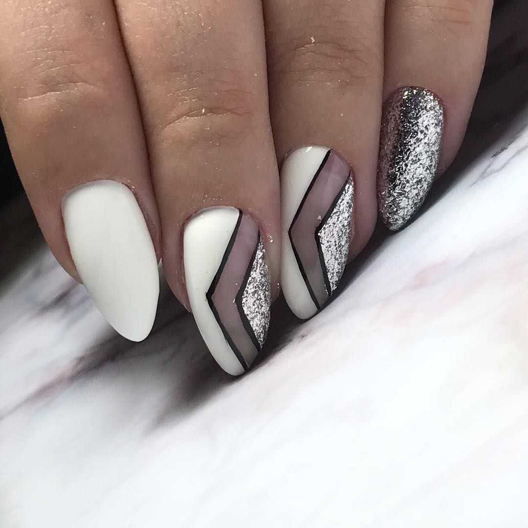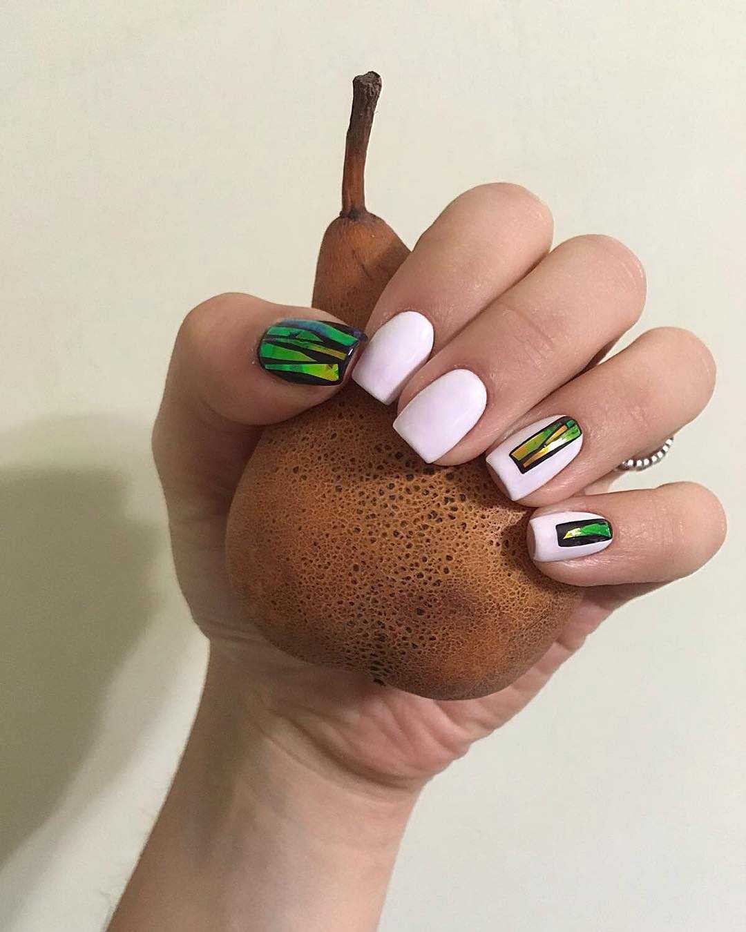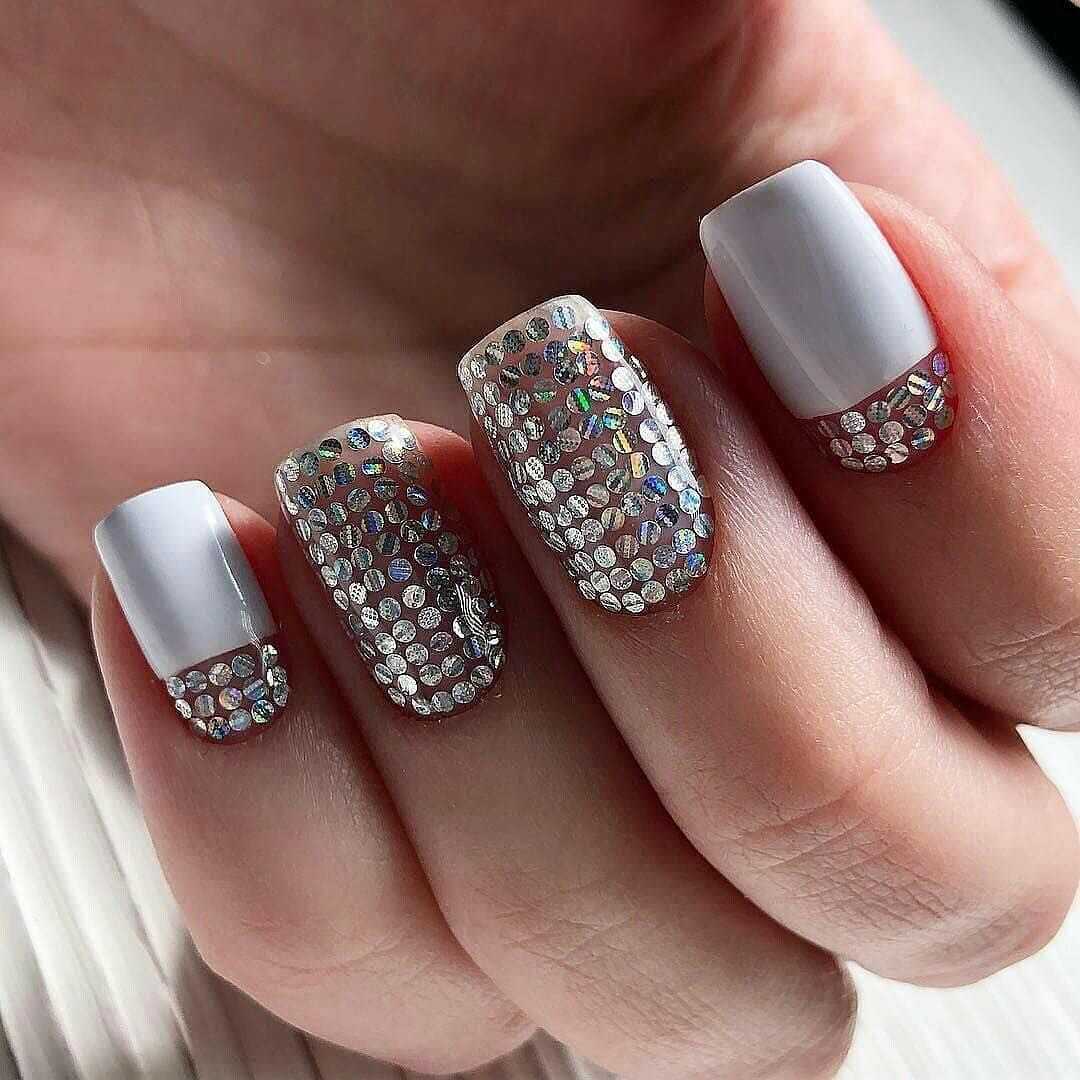 Ахроматические цвета — не имеют оттенка. Поэтому, делая маникюр в этих цветах, больше внимания уделите фактурам. Примером может послужить новогодний черный маникюр с фольгой или белый френч с блестками.