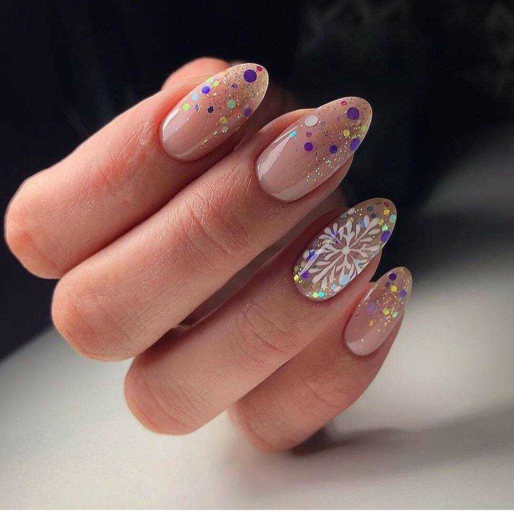 Здесь рекомендуют использовать нюдовые лаки, гель-лаки и камуфлирующие базы на полтона темнее вашего естественного оттенка рук, так маникюр будет смотреться объемнее. Не будет лишним сияющий декор и новогодние рисунки.