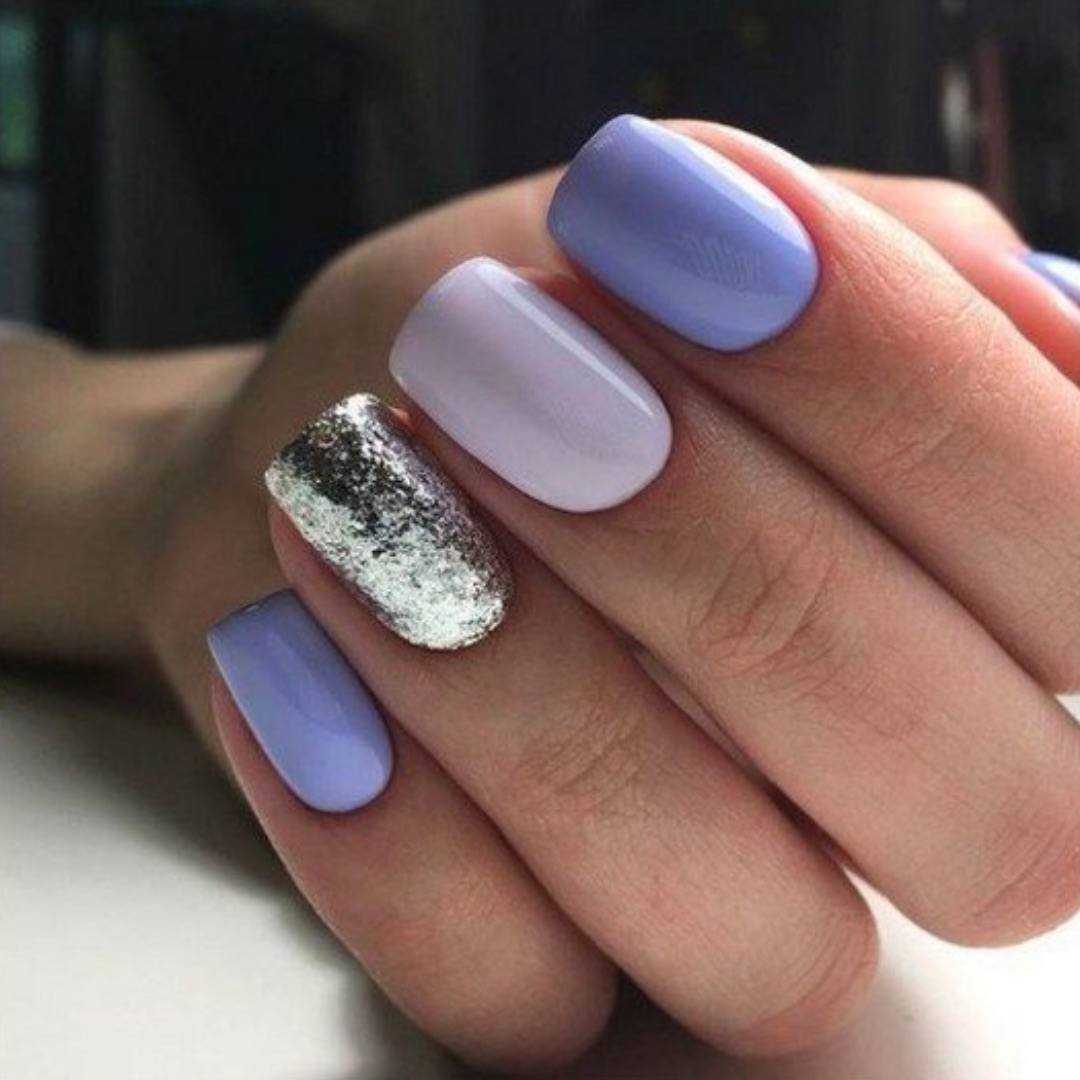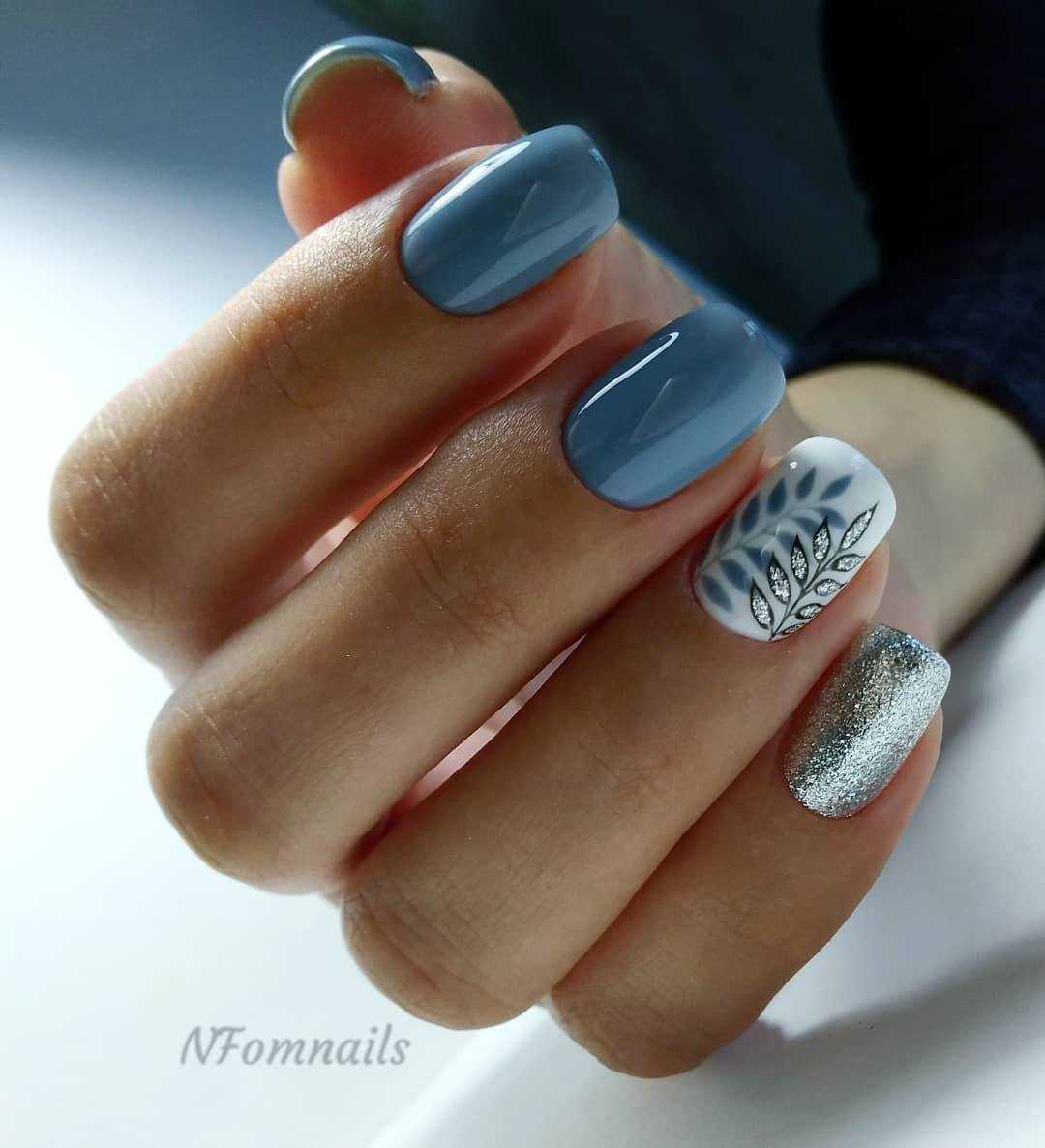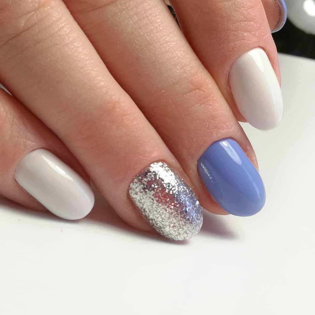 Еще один нежный и легкий оттенок для маникюра – это голубой. Дизайн в бело-голубых тонах навевает мысли о летнем отдыхе, вечерней прохладе и беззаботном отдыхе. Для дизайна ногтей помимо глиттера, можно использовать втирку или меланж.