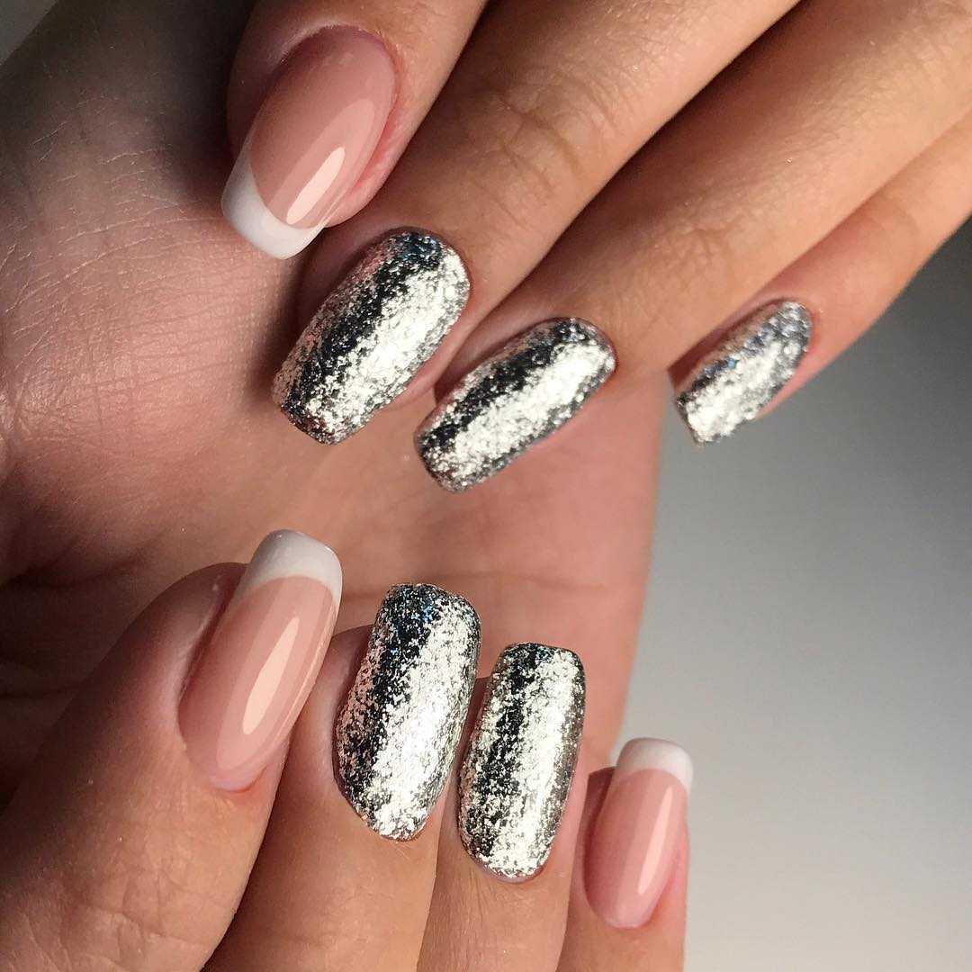 Что касается блесток, то во французском маникюре они могут присутствовать по краю ногтевой пластины, в кружевном декоре, в прикорневой зоне. Великолепно смотрится растяжка блестками. При этом рисовать классическую овальную “улыбку” не нужно, блестки будут имитировать эту заметную деталь френча и нежно растворяться в основном оттенке гель-лака.