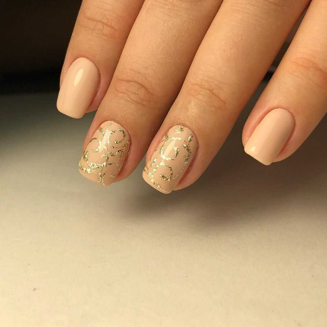 Бежево-золотой маникюр – отличный вариант, когда хочется чего-то отличного от классики. Этот вариант выглядит свежо и оригинально. Золотом можно окрасить кончики, геометрические фигуры, ямочки или леопардовый узор.