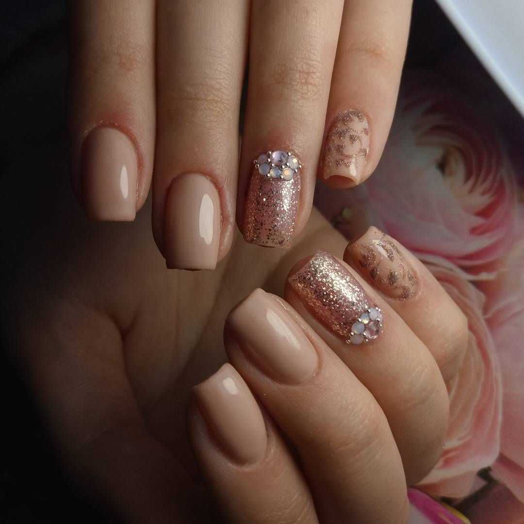 Самый распространенный способ индивидуализации бежевой стилистики оформления. Маникюр с блестками всегда выглядит изящно. Главное — подбирать не слишком контрастирующие оттенки.
