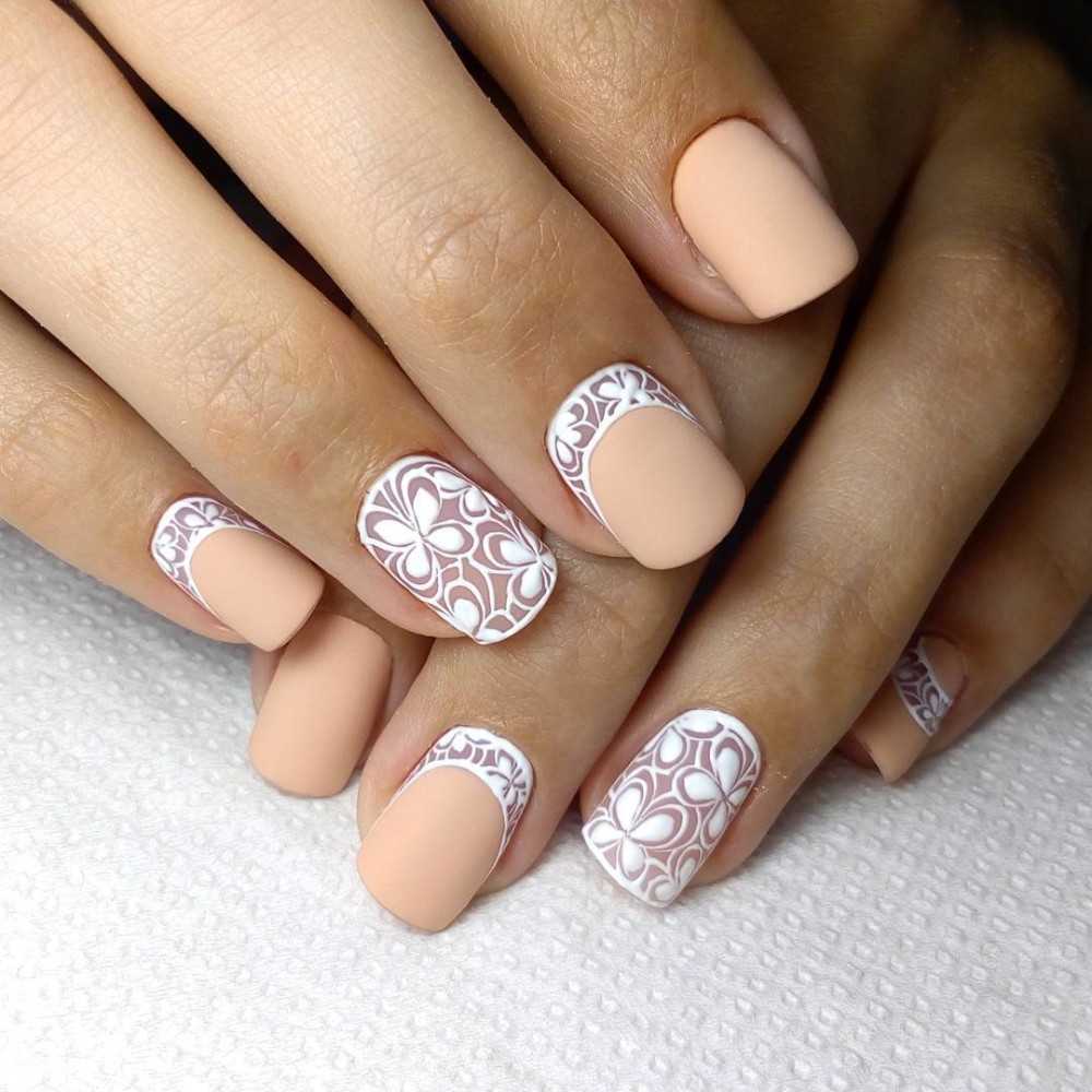 Любой светлый маникюр с бежевой текстурой выигрышно и привлекательно смотрится в сочетании с белыми орнаментами. Создается легкий и непринужденный стиль отображения с большим пространством вариантов для размещения различных элементов декора.