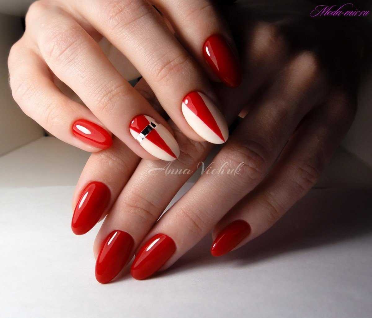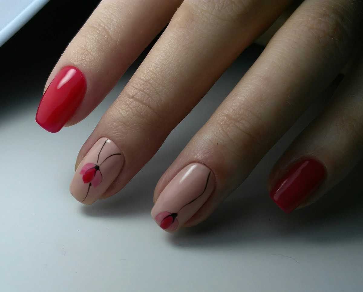 Красно-бежевый маникюр выглядит очень пышно благодаря яркому акценту, который добавляет красный цвет. Матовые бежевые оттенки – самый популярный маникюр в этом году. Вы можете сделать матовые ногти бежевого цвета, а два пальца на обеих руках выделить ярко-красным. Такой маникюр будет выглядеть очень женственно и экстравагантно. Красный французский на бежевой основе также считается хорошим вариантом. Для такого дизайна стоит добавить украшения в виде нежных изображений цветов или узоров.
