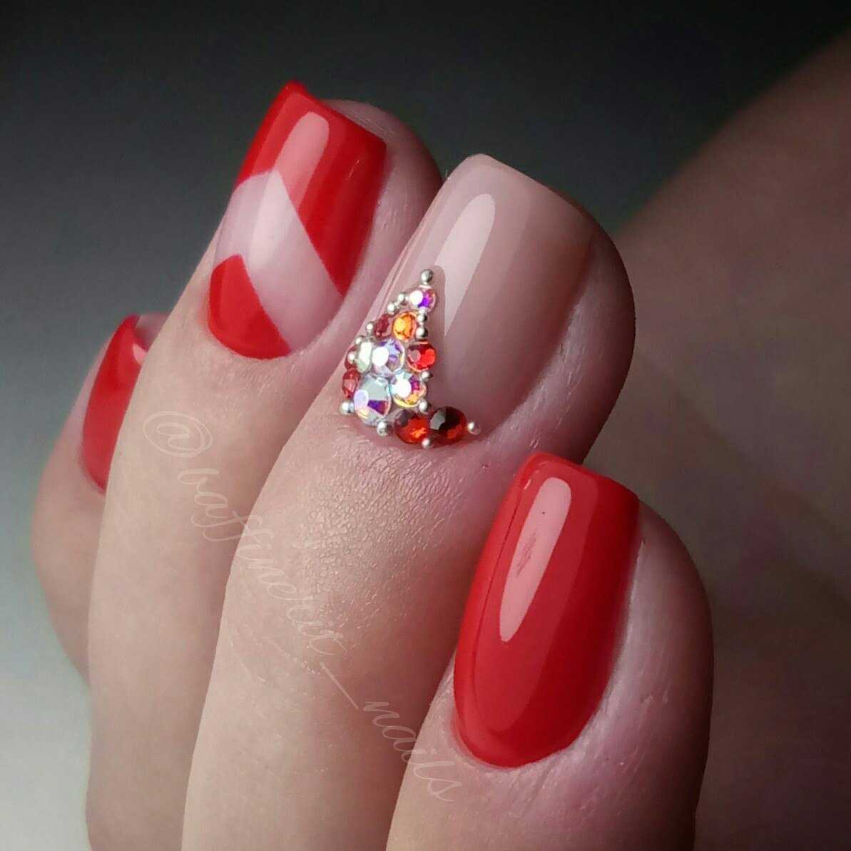 Бежево-красный маникюр смотрится непринужденно и нежно. Достаточно добавить образу некого рисунка или использовать стразы среднего размера.