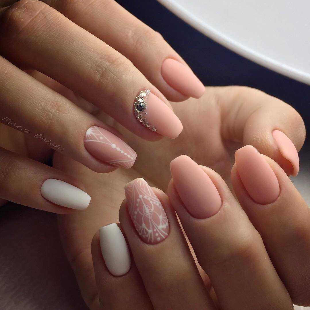 В тренде однотонное окрашивание ногтей в бежевый и розовый. Популярностью пользуются матовые нейл-арты, которые смотрятся еще нежнее и благороднее. Что касается декора, то на бежевом фоне красиво смотрятся веточки и листья, аккуратные полоски и точки, стразы и камни в прикорневой зоне. При желании можно дополнить бежево-розовый маникюр белым или черным гель-лаком. Сделайте с помощью этих дополнительных оттенков красивый акцентный декор с цветами или геометрией.