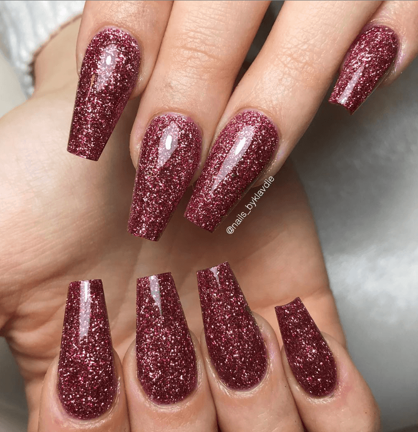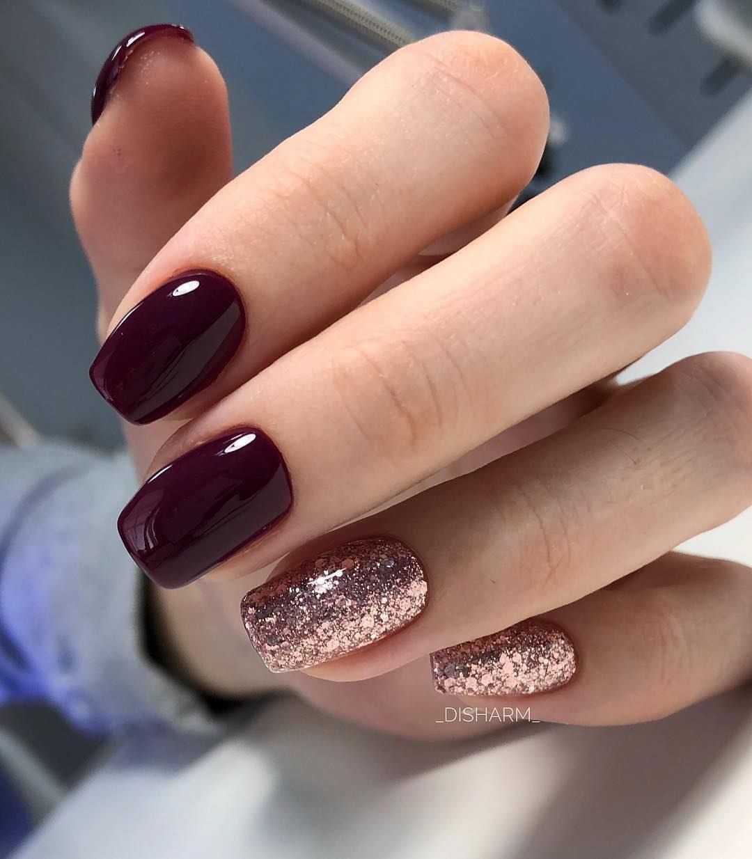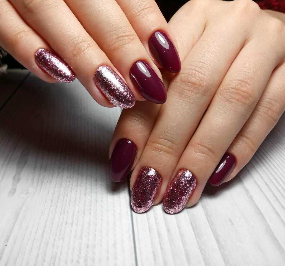 Блеск по-прежнему в моде. И бордовый маникюр с его помощью можно легко разнообразить. Выбирайте шиммерные оттенки лака или сочетайте классическое глянцевое покрытие с песочными блестящими топерами. Не забывайте про втирки, которые придают красивое переливание.