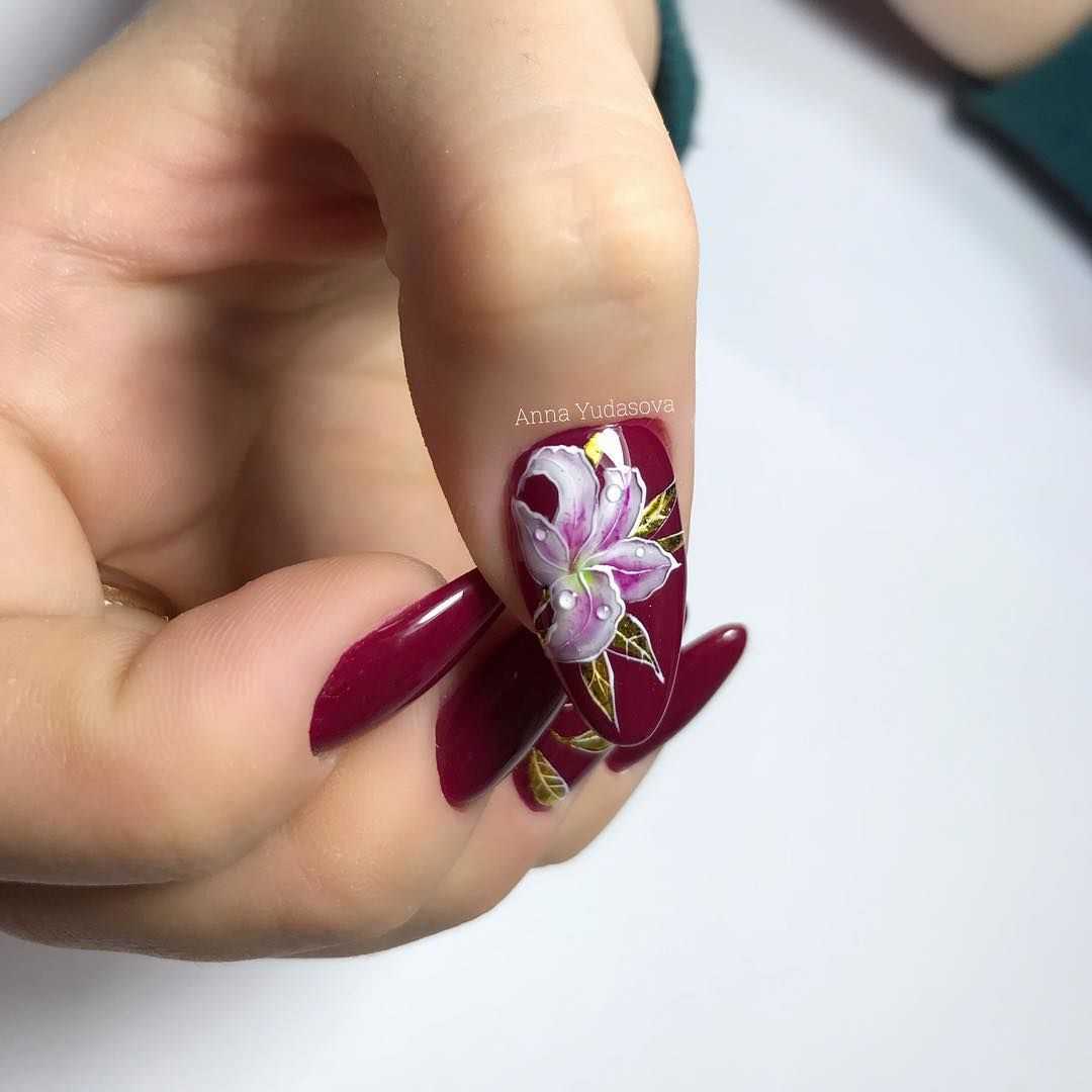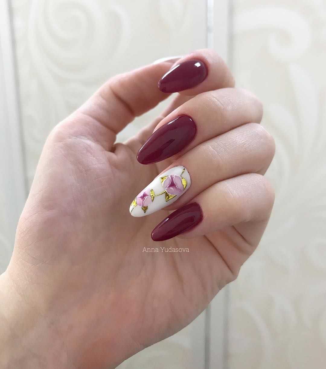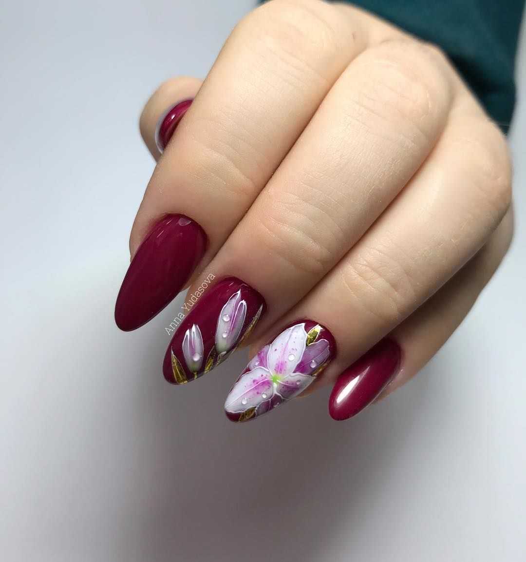 Бордовый цвет в качестве основы для маникюра выбирают только уверенные в себе и элегантные дамы. Приглушенный и сдержанный оттенок имеет множество преимуществ, которые создадут невероятный и сногсшибательный дизайн. Маникюр с цветочными рисунками на бордовой основе превращает умеренный дизайн в непревзойденный маникюр для различных мероприятий.