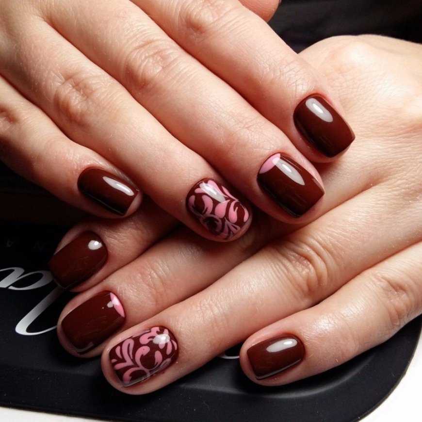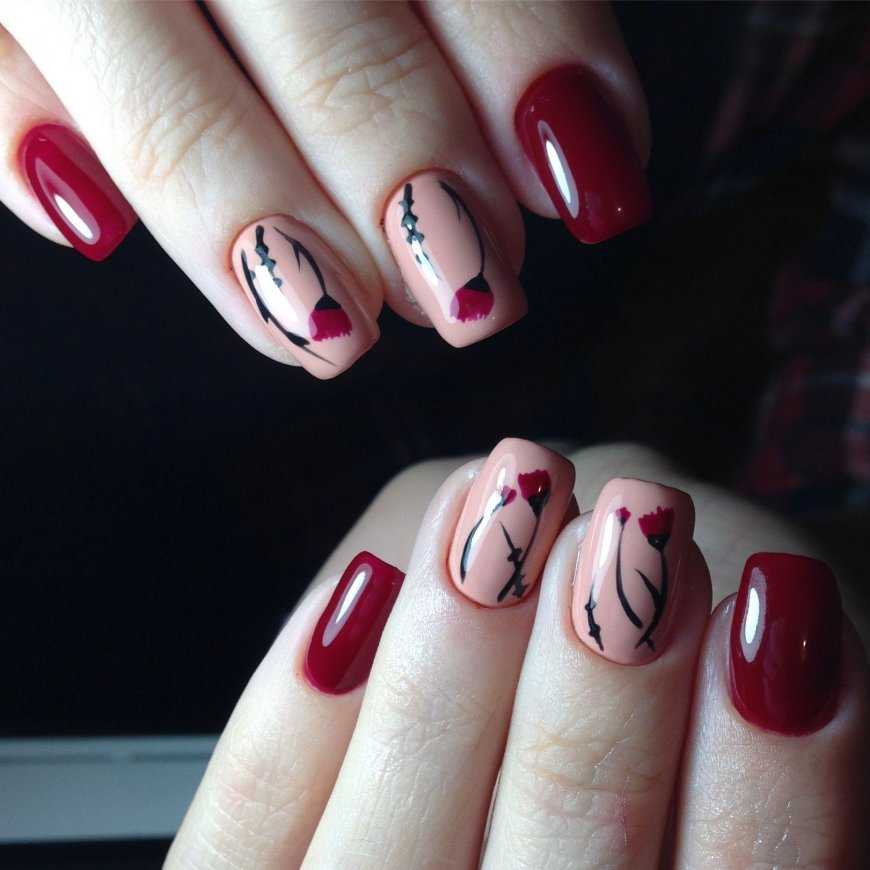 Девушкам с короткой длиной ноготков не стоит сдерживать себя и отказываться от выполнения бордового маникюра с цветочными изображениями. В данном случае главное не перегружать дизайн излишними узорами, а выполнить несколько бутончиков или веточек. Таким образом, получится очень нежный и гармоничный маникюр, который дополнит различные образы.
