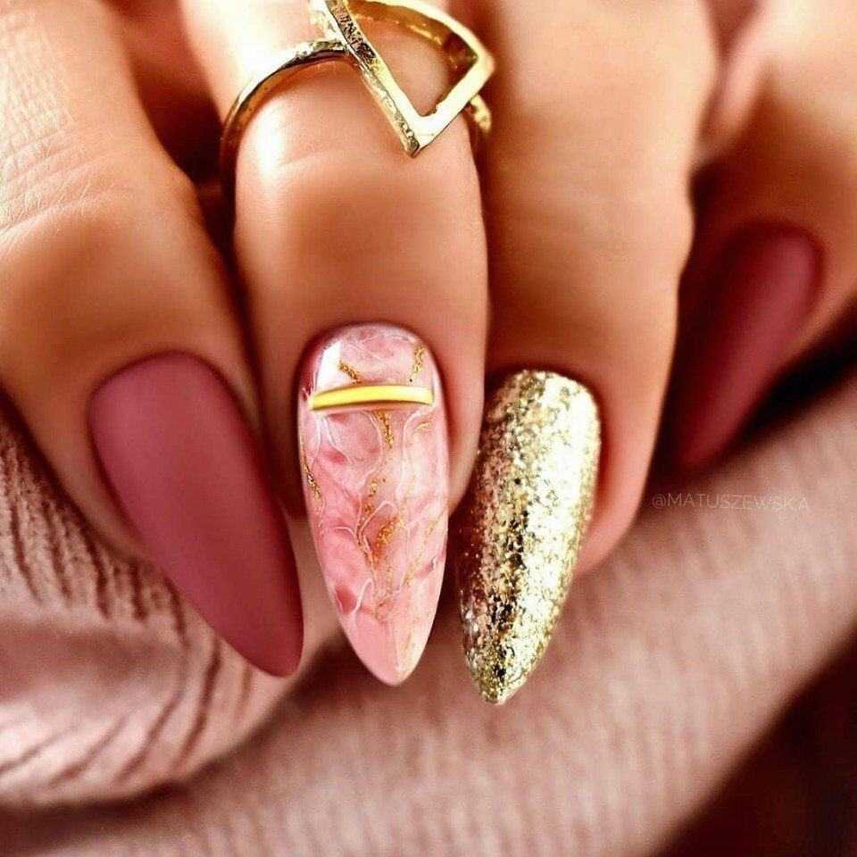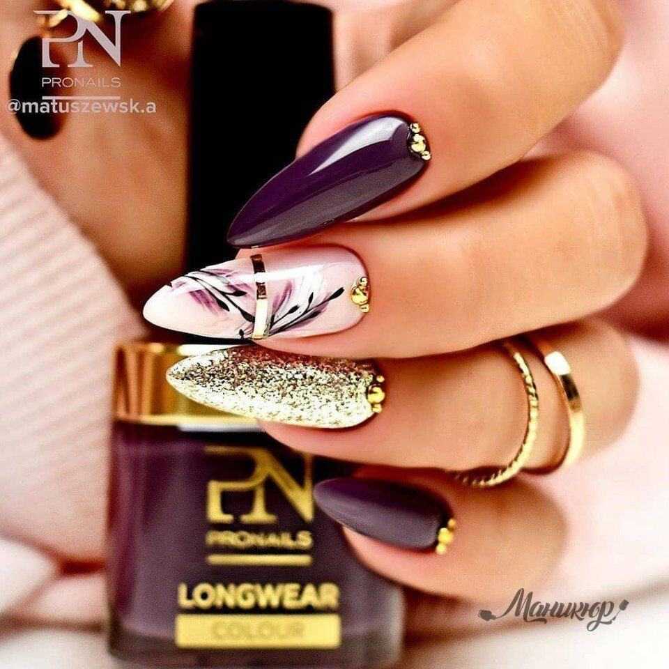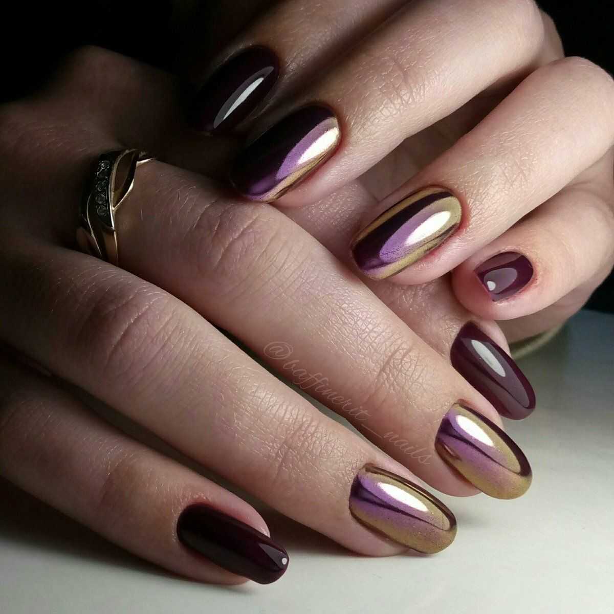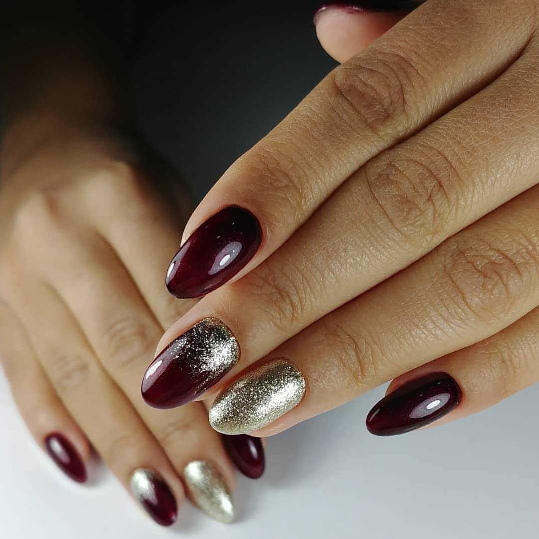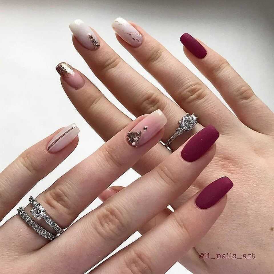 С насыщенными винными оттенками сочетается много вариантов гель-лаков. Начнем с классических базовых вариантов: с белым и черным лаком, а также с золотом в виде пудры, блесток, фольги или втирки. Если у Вас в гардеробе есть бордовое платье, но к нему не хочется делать темный маникюр, то разбавьте маникюр розовым, бежевым оттенком или другим модным цветом маникюра. Для любителей более экстравагантных сочетаний подборка фото самых ярких и необычных вариантов оформления ногтей.