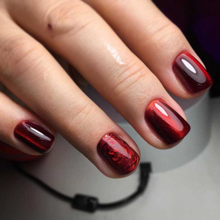 Сочетание красного и винного, рубинового, вишневого — отличная идея дизайна в стиле омбре. Для других вариантов декора лучше выбирать разные по плотности оттенки лака, чтобы получился эффект многослойности, а не двухцветности.