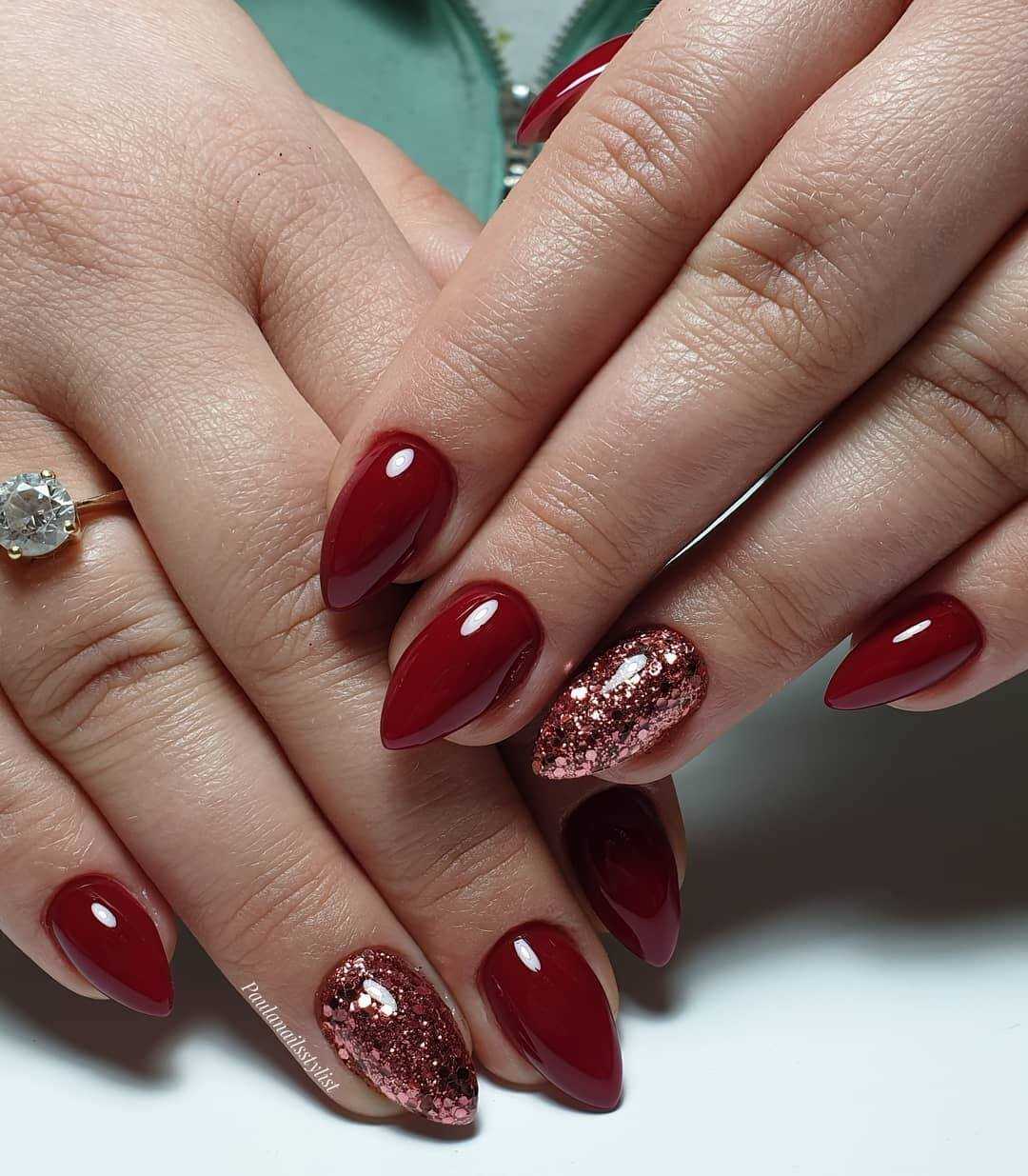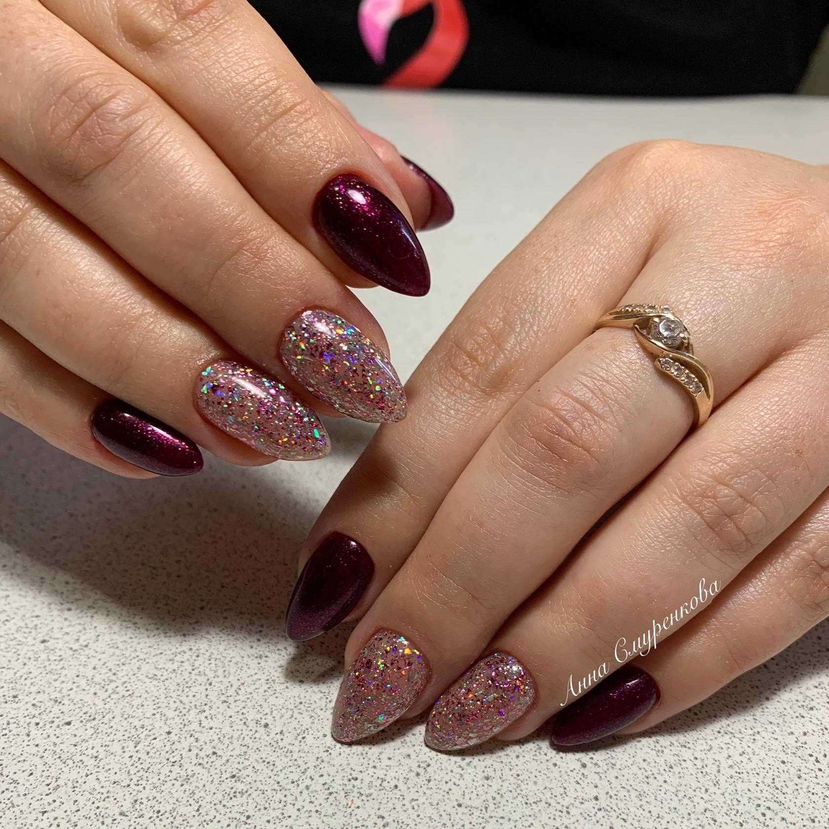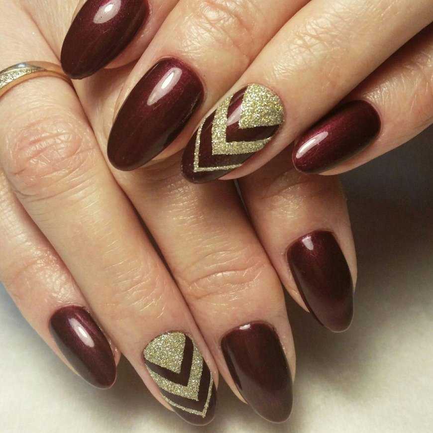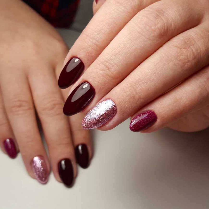 Ноготки миндалевидной формы считаются эталоном женственности и изящества, поэтому прекрасно подходят для выполнения маникюра в бордовых тонах. При этом плавность линий кончика ноготка позволяет примерять самые разные техники, начиная от классического однотонного покрытия, заканчивая абстрактными композициями и нестандартной линией френча. Блёстки можно использовать для нанесения красивых узоров, выделения частей ноготка или прорисовки деталей. Любая вариация смотрится очень привлекательно. Одно «но», проявить свои способности миндалевидная форма может только на средних или удлинённых ногтевых пластинах.