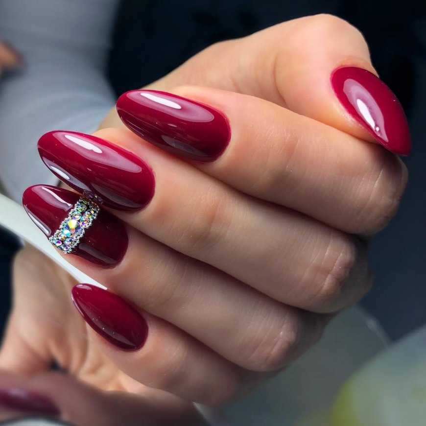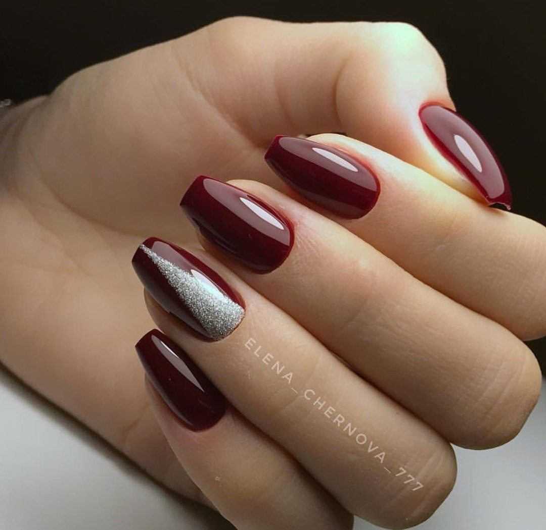 Разбавить темно-бордовый цвет можно отдельным маникюром для ноготка безымянного пальца. Идея – вкрапленные стразы серебристого цвета. Вне зависимости от формы ногтей, маникюр в бордовых тонах идет как длинным, так и коротким ногтям. Наилучше всего бордовый лак подходит обладательницам светлой кожи: на ней он смотрится очень изысканно.
