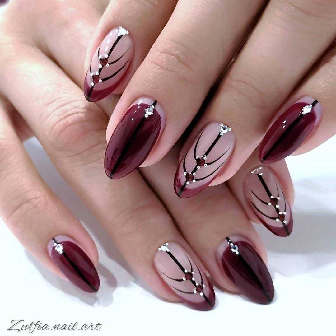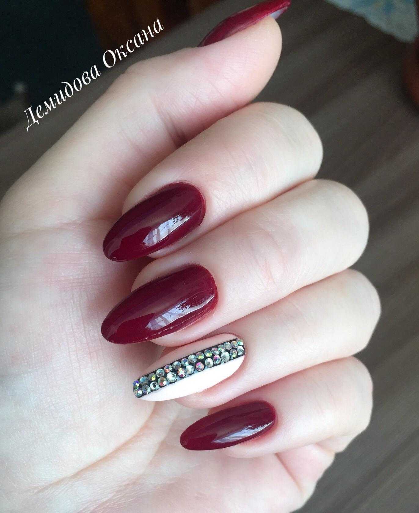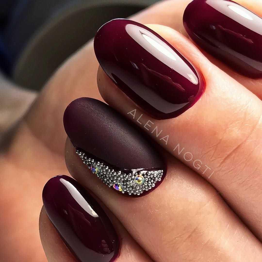 Со стразами. Камешки или стразы послужат богатым украшением для вашего маникюра: с помощью кристаллов собрать определенную форму или хаотично разместить их на поверхности ногтей. Ваша фантазия безгранична, вы можете создать свой собственный уникальный стиль; винный оттенок добавляет нотку роскоши.