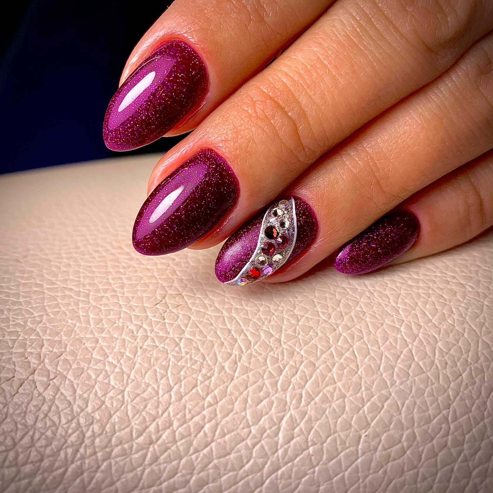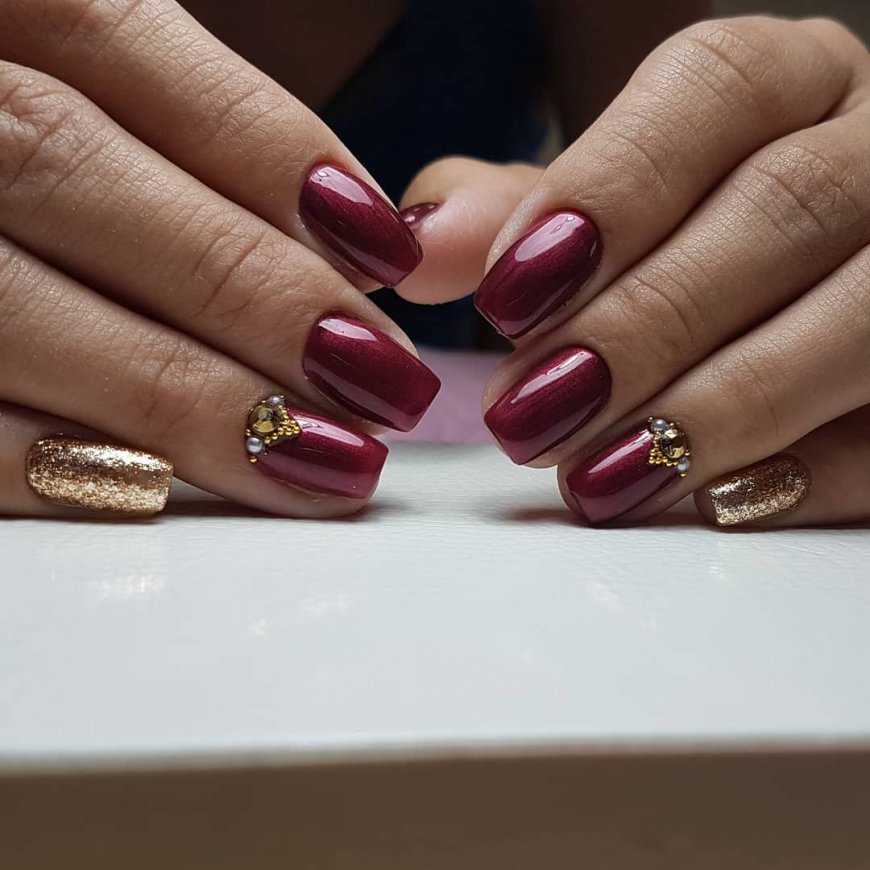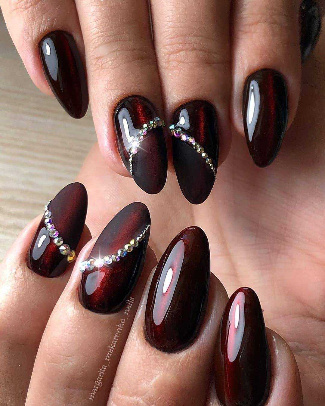 Со стразами. Камешки или стразы послужат богатым украшением для вашего маникюра: с помощью кристаллов собрать определенную форму или хаотично разместить их на поверхности ногтей. Ваша фантазия безгранична, вы можете создать свой собственный уникальный стиль; винный оттенок добавляет нотку роскоши.