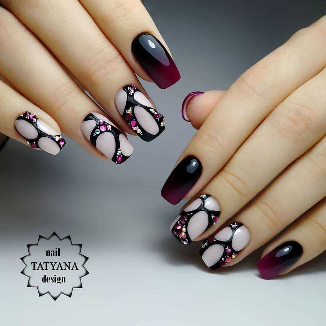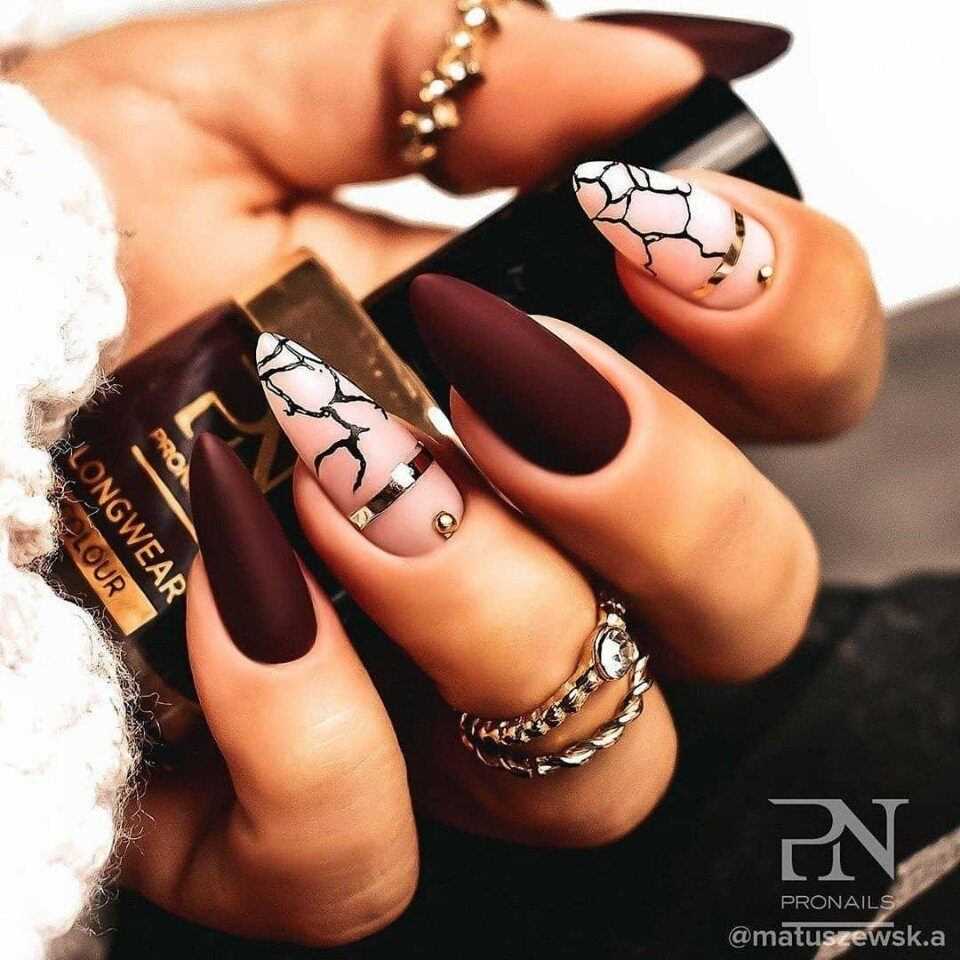 Модный геометрический узор с вертикальными полосами и негативным пространством также шикарен. Черный и бордовый цвета считаются лучшей цветовой гаммой для этого узора. На фото представлены все последние дизайны ногтей в бордовом цвете.