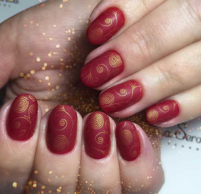 Идея с выбитыми на бордовом основании, цветов, линий и других изящных принтов – еще одна идея маникюра, который напоминает этакую бархатную вуаль на ваших ноготках. Выглядит достойно.