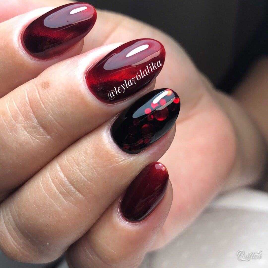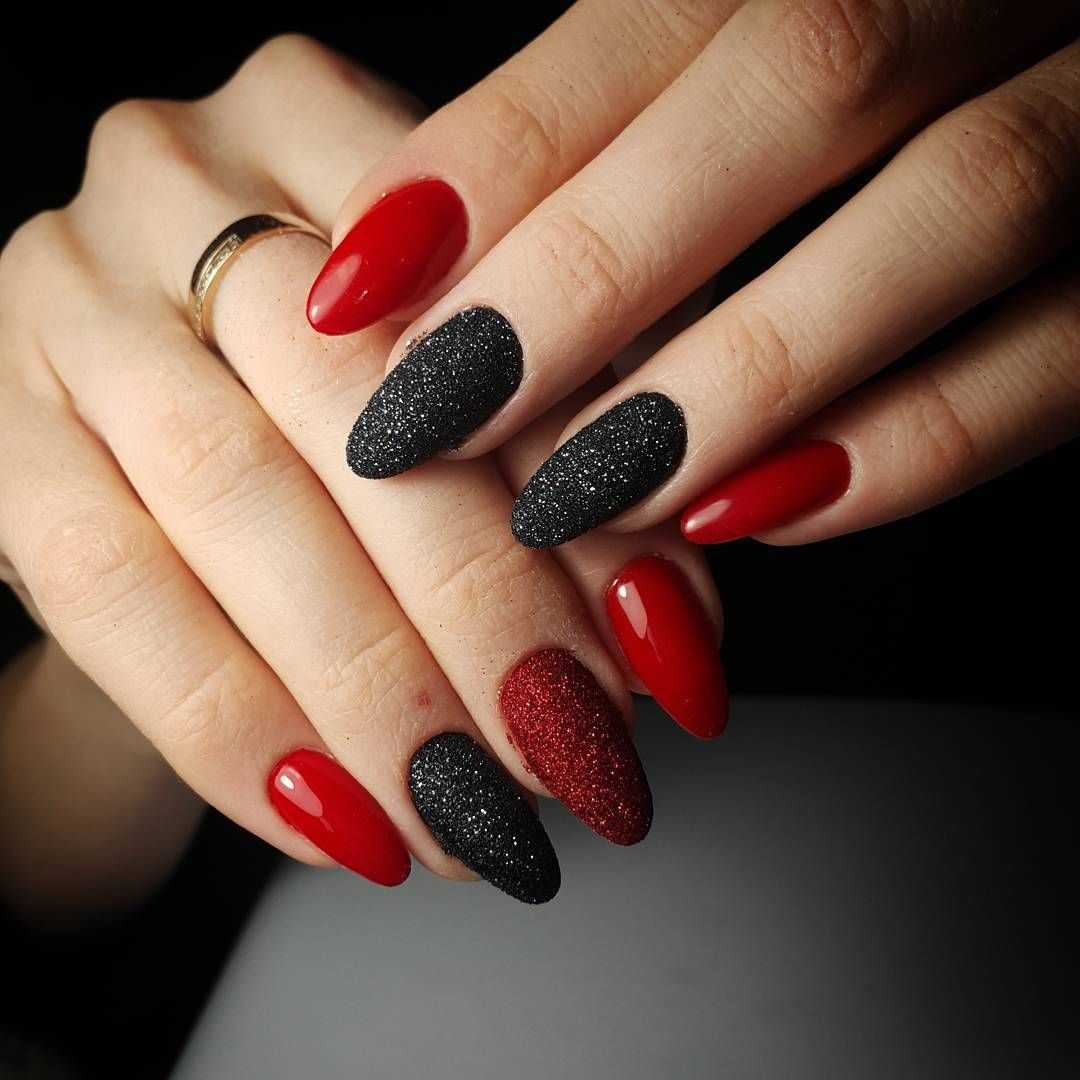 В красно-черном цвете шикарно выглядит градиентный маникюр. Выбирайте для дизайна гель-лаки с блестками, шиммером, глиттером и другими блестящими текстурами. Отлично смотрится соседство красного матового гель-лака и черного гель-лака с пайетками. Стоит учитывать, что оба цвета выглядят достаточно насыщенно и броско, поэтому не рекомендуется нагромождать ноготки геометрией, абстракцией, флористикой и другим декором. Оптимальный выбор – это однотонный маникюр с блестящим акцентом на 1-2 ноготках. Даже в торжественных образах такой маникюр будет смотреться уместно и сдержанно.
