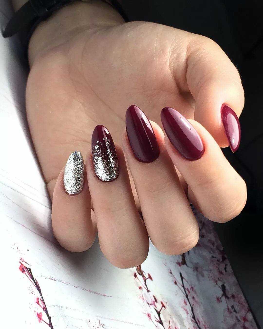 Бордовые ногти теперь принято украшать не только золотом, но и серебром. Вы можете использовать блестки, металлические пигменты, фольгу, ромбы и наклейки. В коллекциях популярных производителей гелькоутов можно найти множество интересных оттенков бордового цвета, от светлых до очень темных.