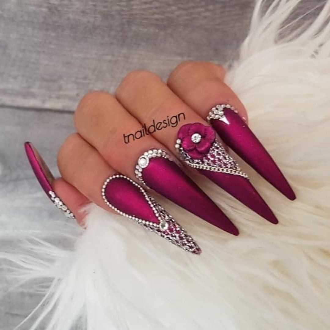 Стоит помнить о том, что столь выразительный и без того цвет основного фона не должен быть перегружен массовым заполнением блесток и страз. Ведь так можно удешевить образ в целом, отразив безвкусную комбинацию глубокого пигмента и огромного количества наляпистых элементов ногтевого декорирования. Всего понемногу, и вы не ошибетесь.