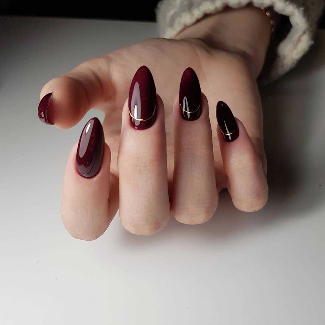 Модный геометрический узор с вертикальными полосами и негативным пространством также шикарен. Черный и бордовый цвета считаются лучшей цветовой гаммой для этого узора. На фото представлены все последние дизайны ногтей в бордовом цвете.