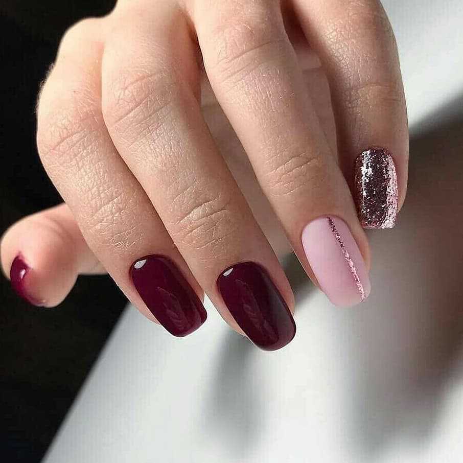 - использовать лак с мелким шиммером и наносить его только на несколько ногтей полностью, остальные окрашивая в основной бордовый;