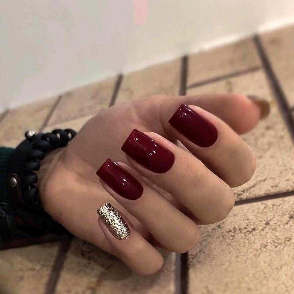 На торжество или в кафе на вечеринку будет актуально сделать маникюр, сочетая переливы бордо с золотистым оттенком. Можно использовать для этого золотистый лак, а также различные глиттеры и шаммеры.