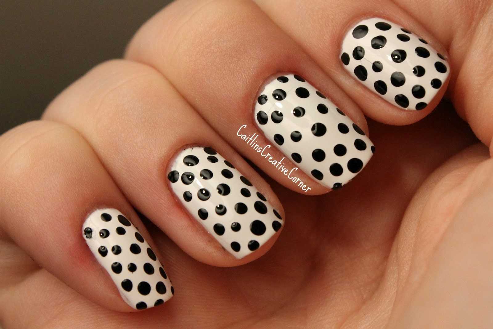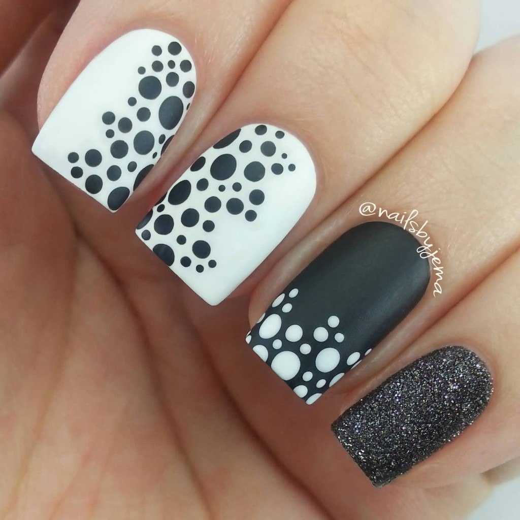 Сделать точечный маникюр под силу даже новичку. Просто нанесите базовый лак для ногтей, например, белый, окуните острие в черное покрытие и нарисуйте на ногтях точки разного диаметра. Возможно, этот дизайн не подходит для разных случаев, но на каждый день он будет лучшей идеей для веселого нейл-арта.